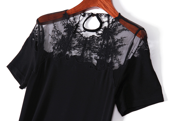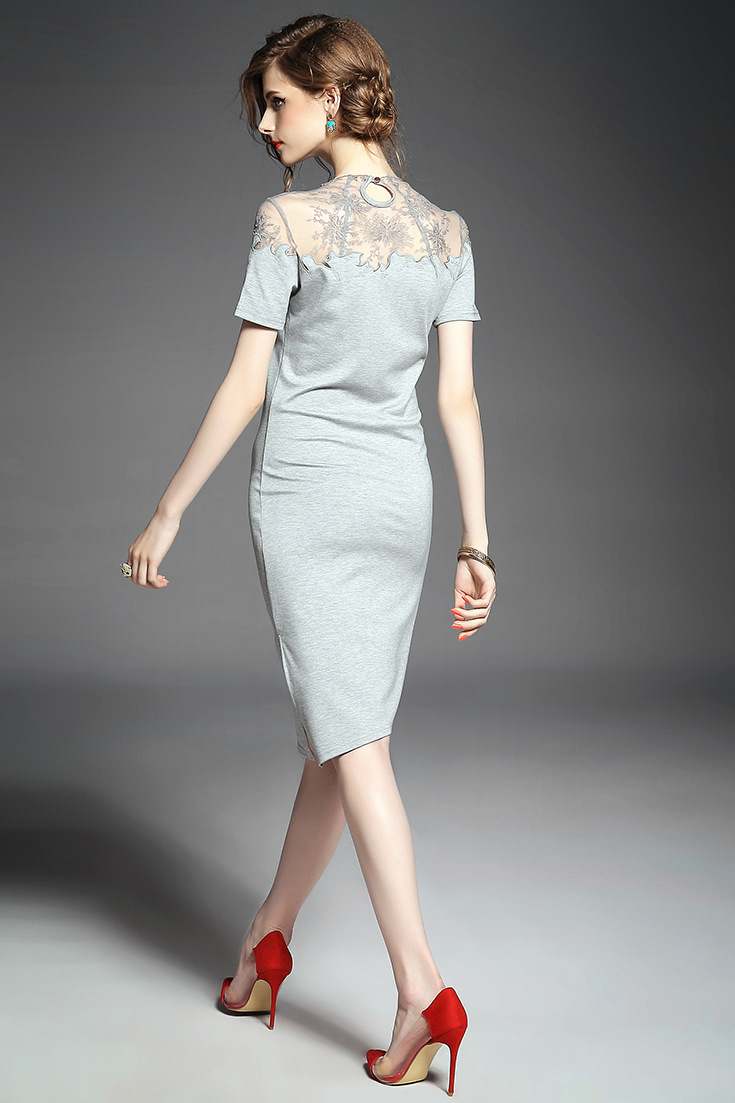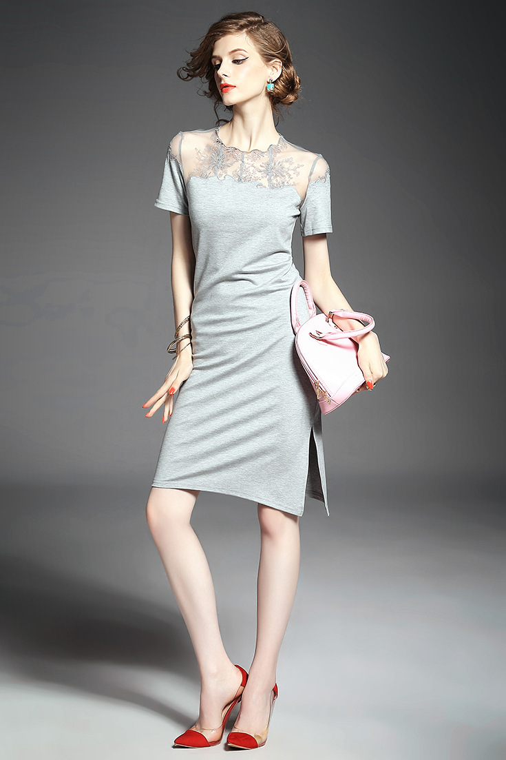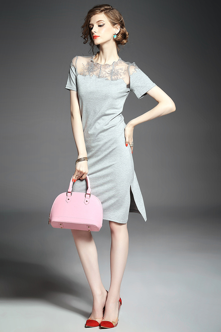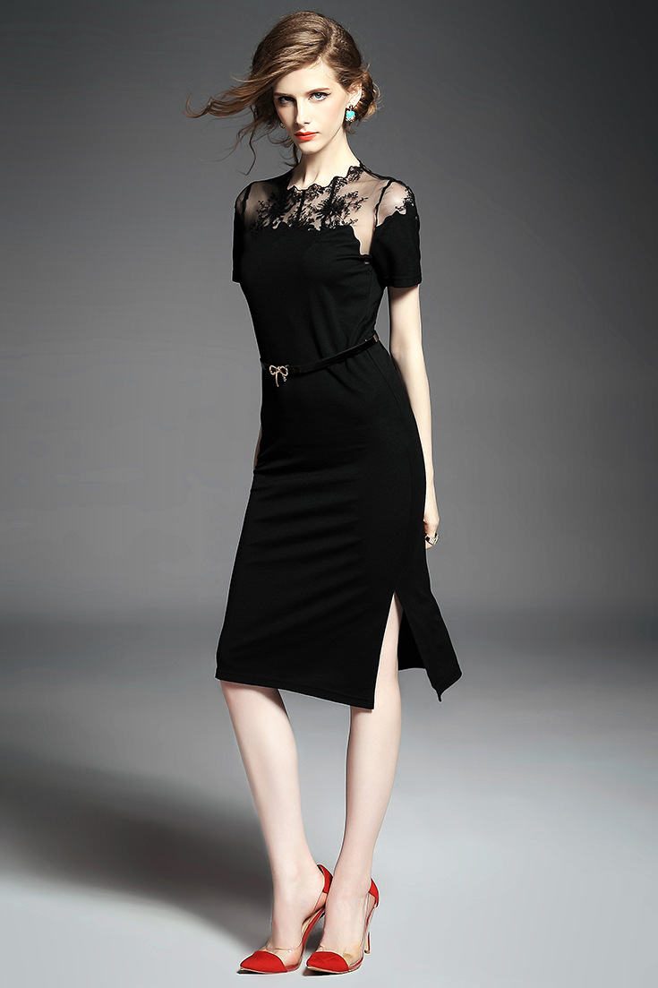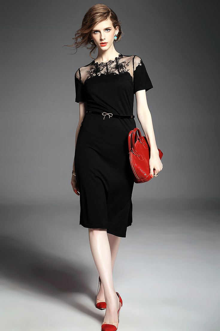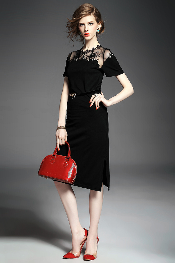 > 2015夏季新款 欧美大牌纯色气质波浪边绣花拼接弹力修身一步裙