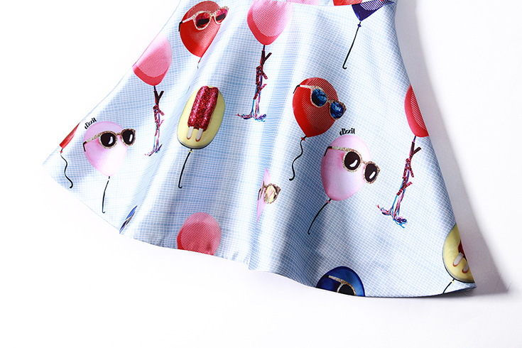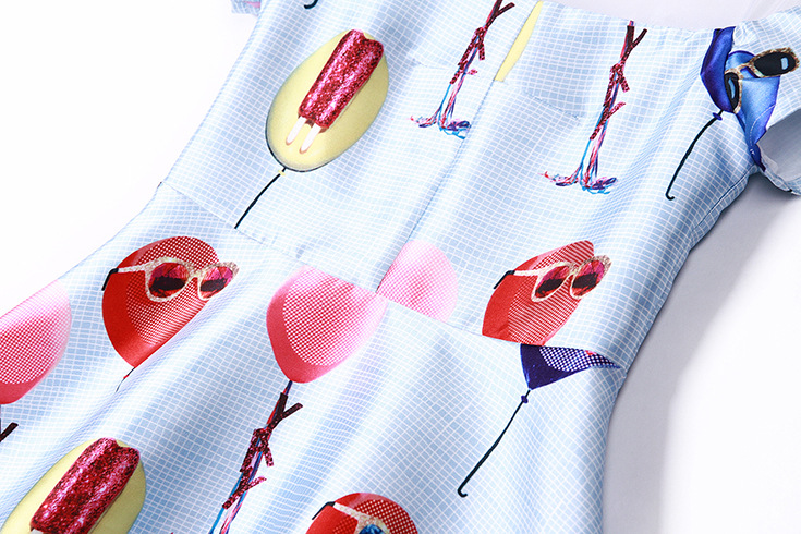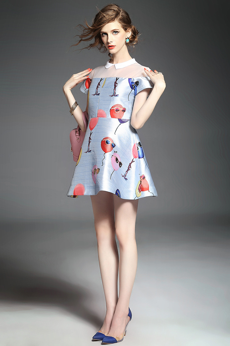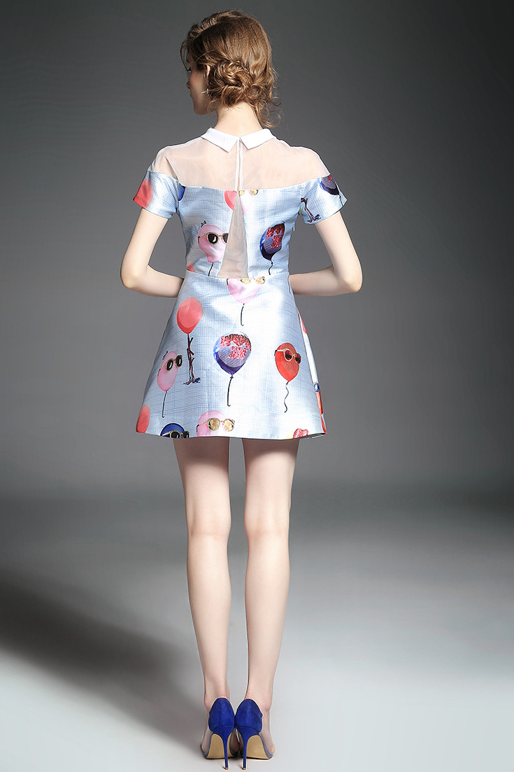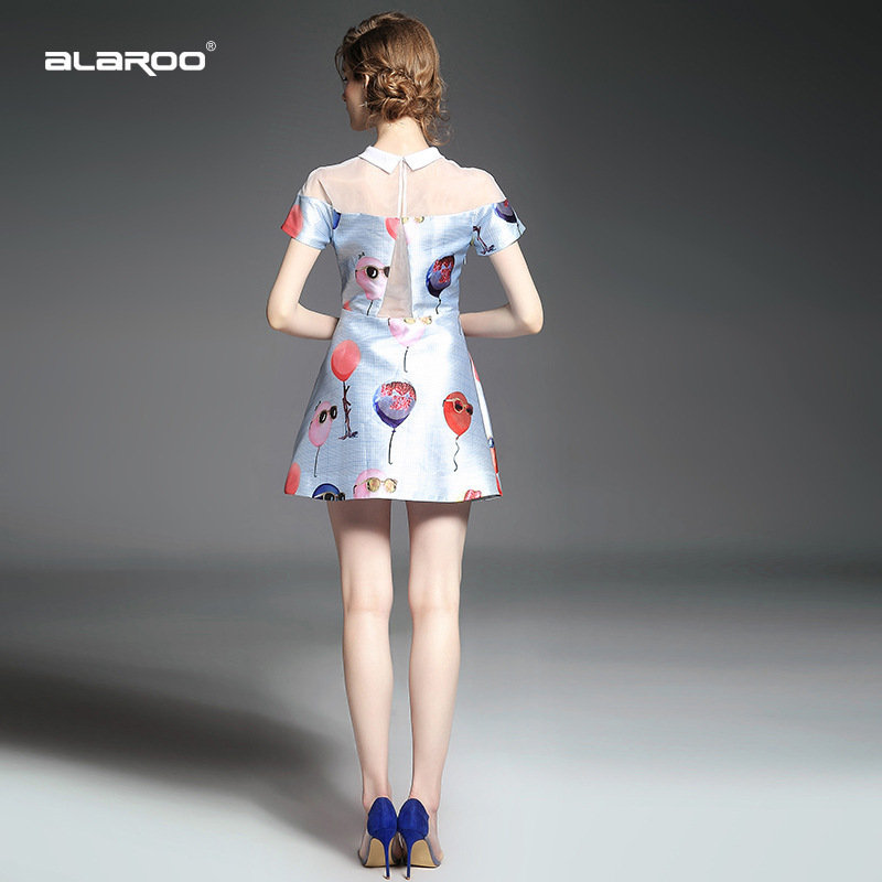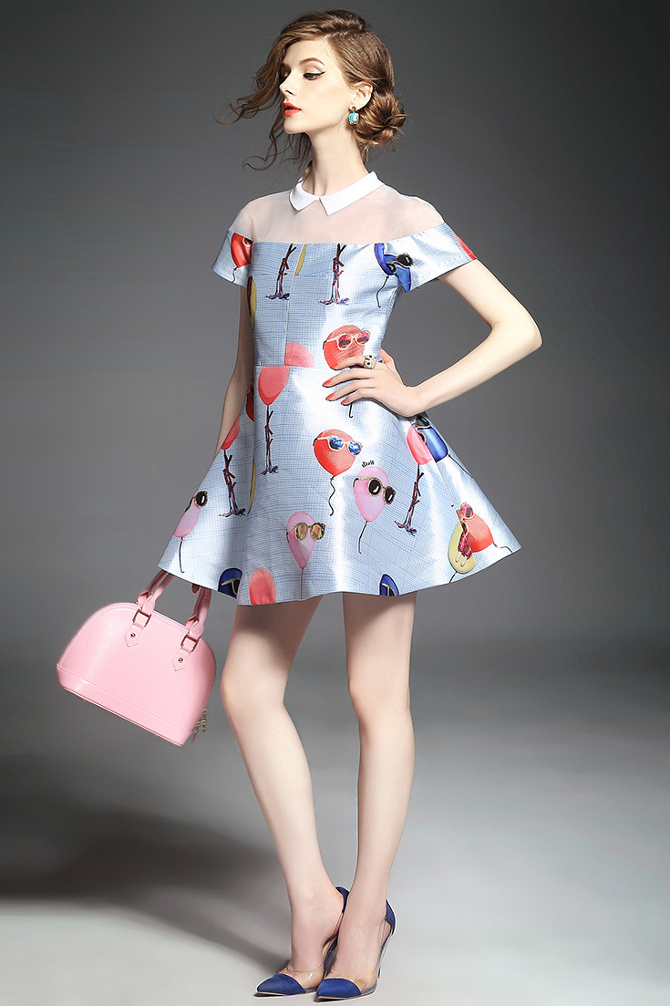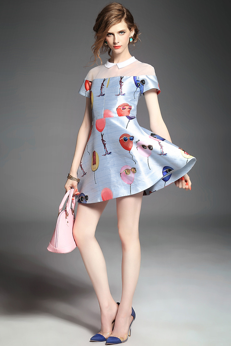 > 2015欧美女装翻领短袖欧根纱拼接印花大摆a字短裙夏