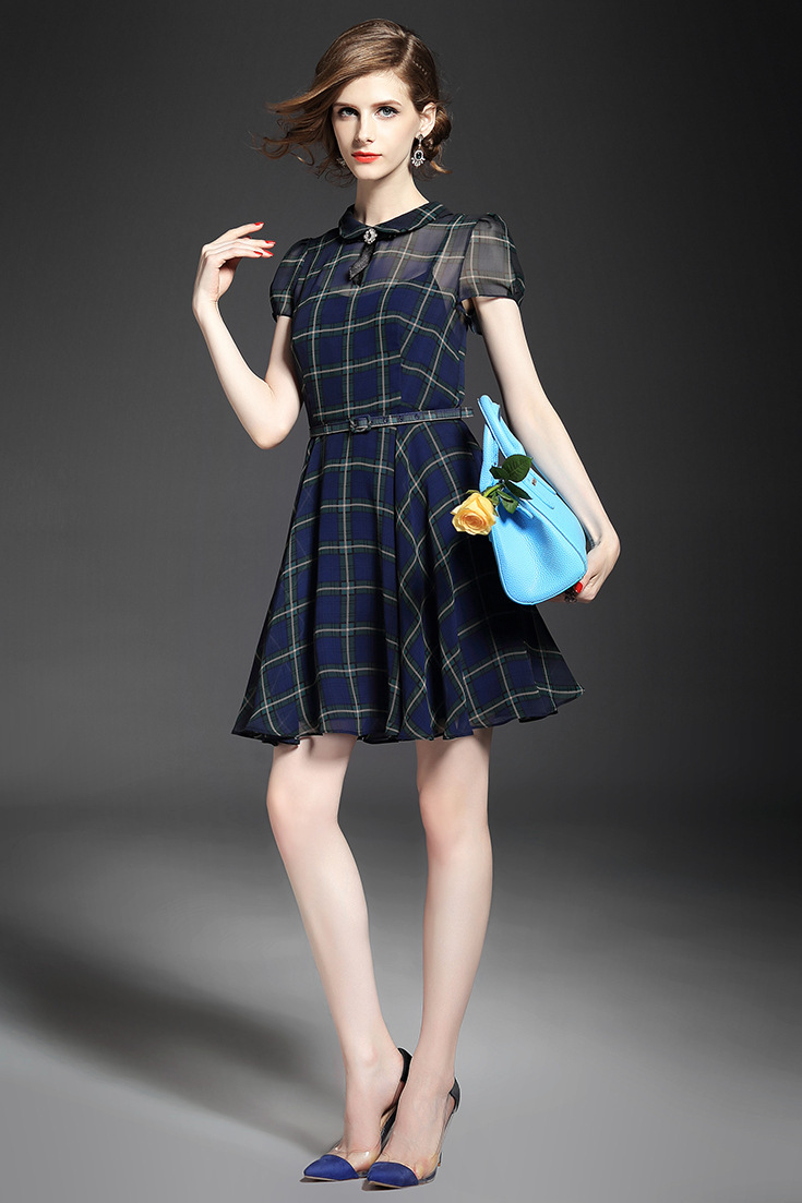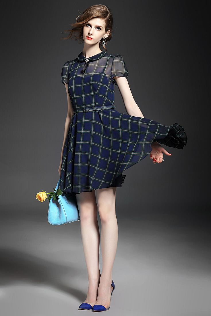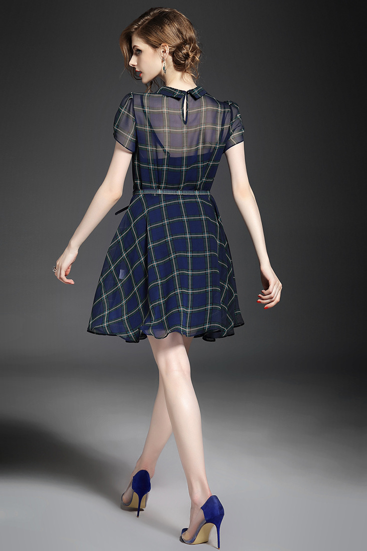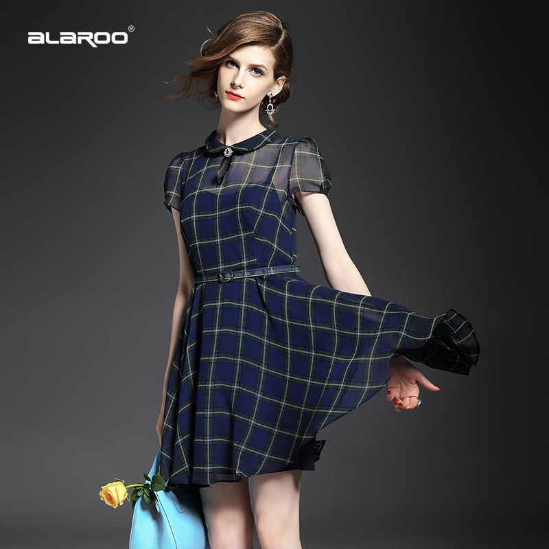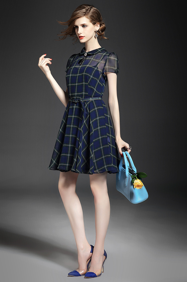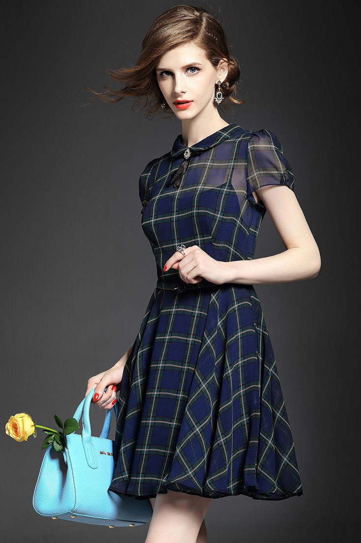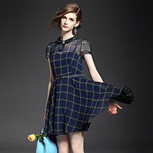 > 2015夏 翻领钉珠蝴蝶结淑女气质格纹修身连衣裙送吊带