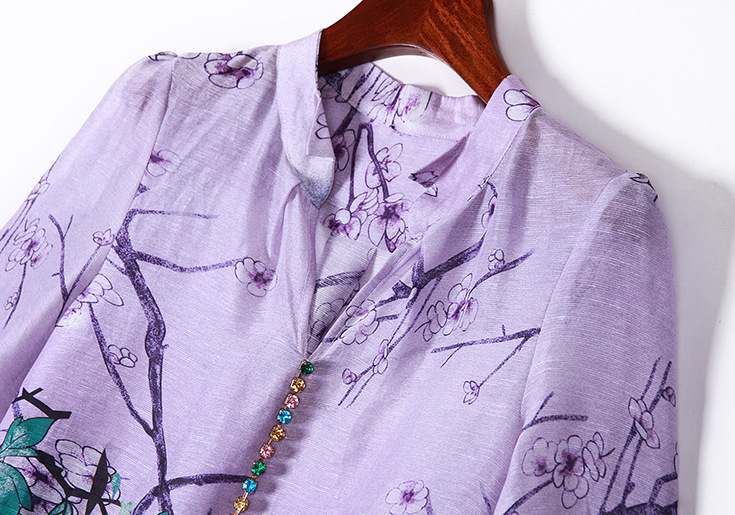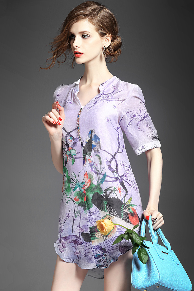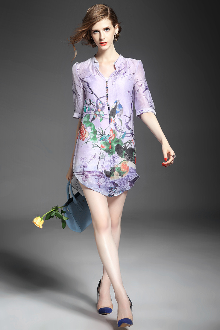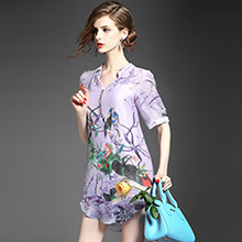 2015春夏季新款欧美风印花真丝连衣裙七分袖衬衣领时尚A字裙