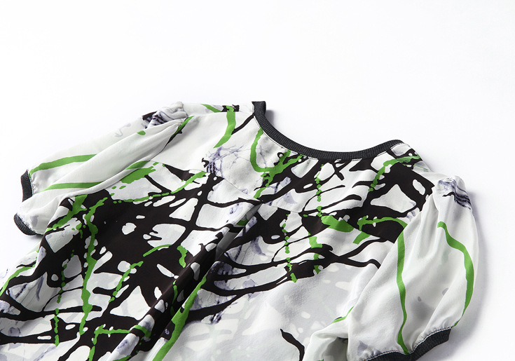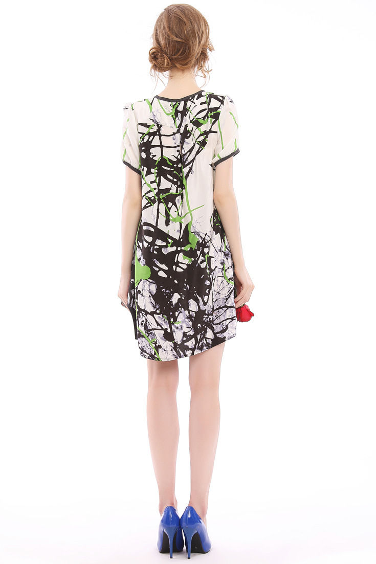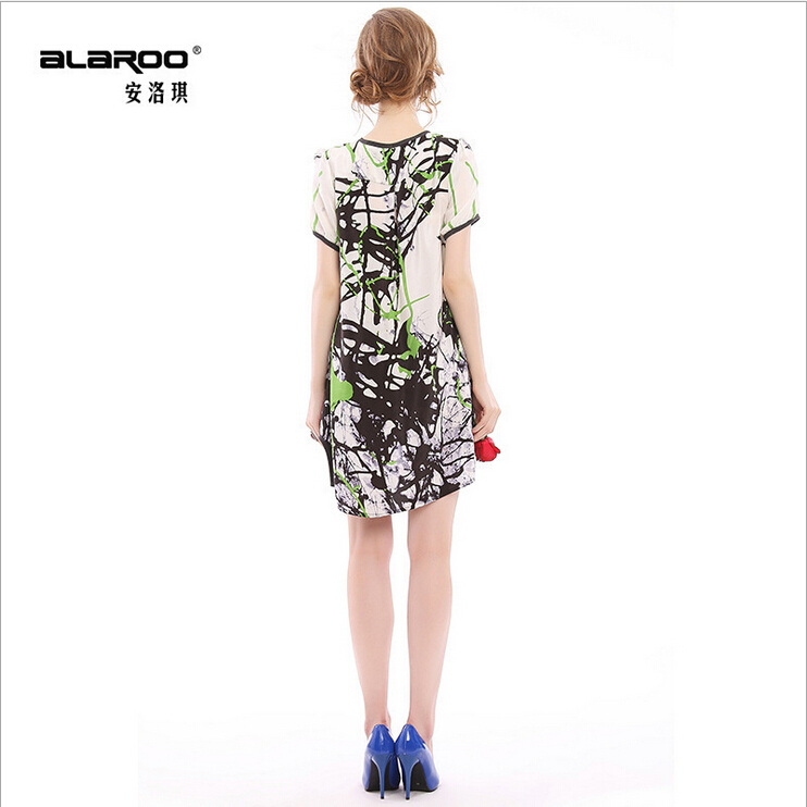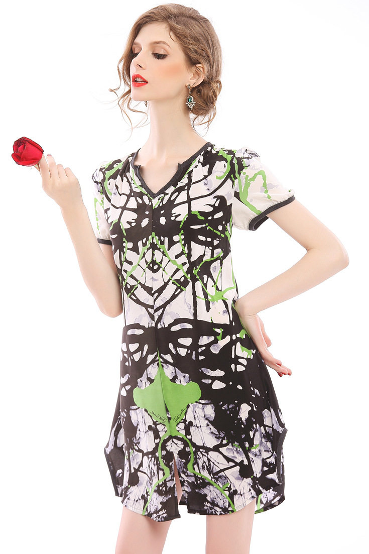 > 2015春夏女装新款气质真丝印花性感V领短宽松袖连衣裙