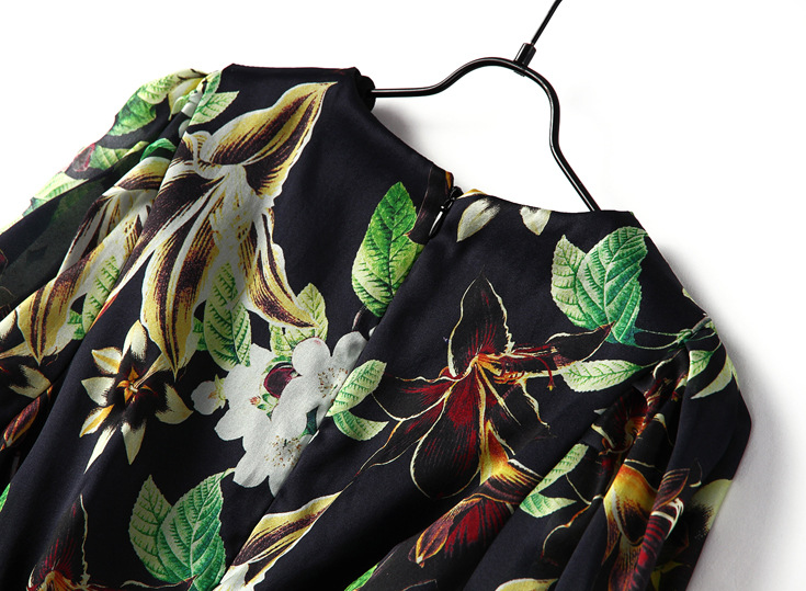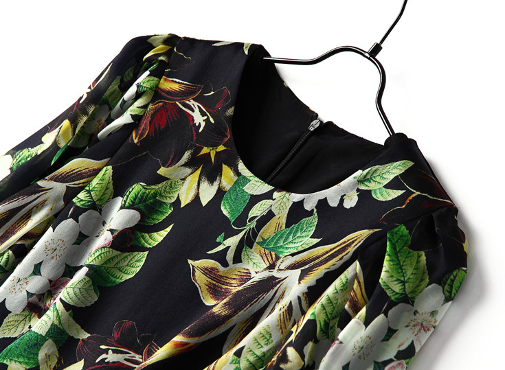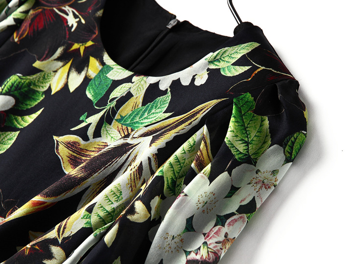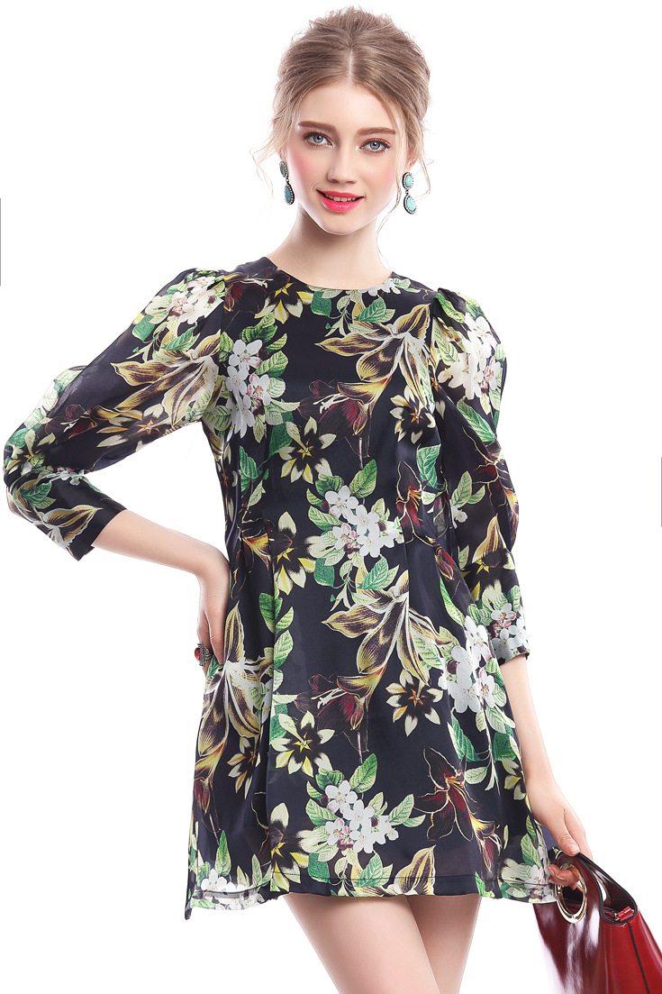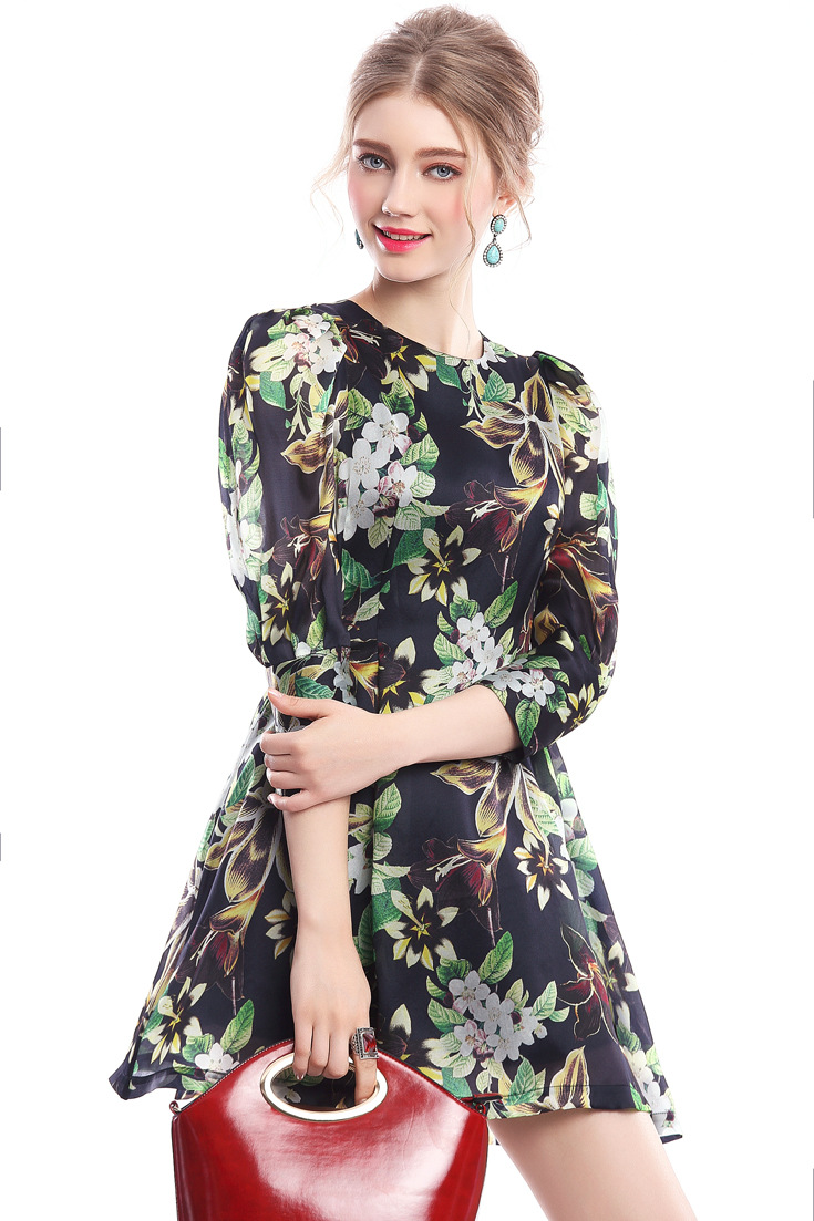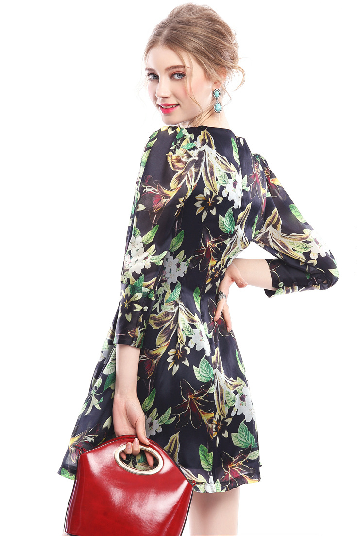 2015春夏新款欧美风印花高档桑蚕丝七分袖A字裙真丝连衣裙