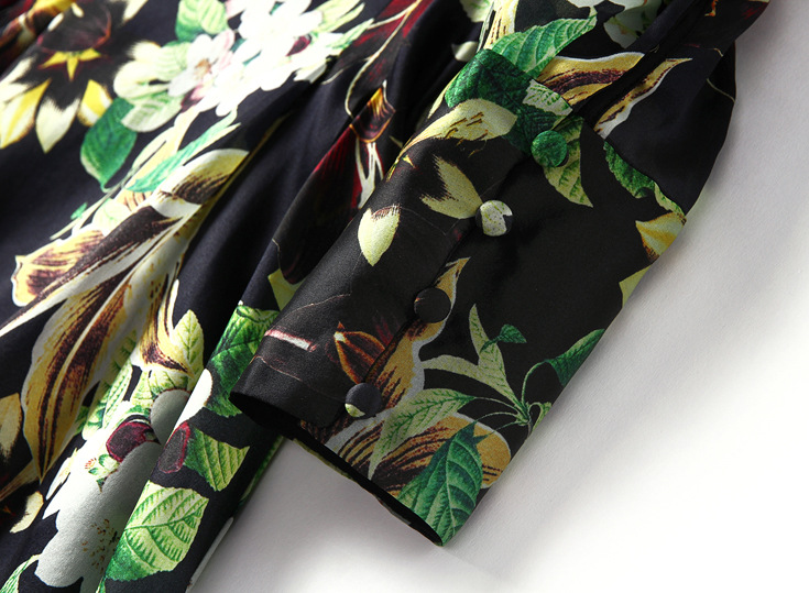 2015春夏季新款欧美风印花真丝连衣裙七分袖衬衣领时尚A字裙