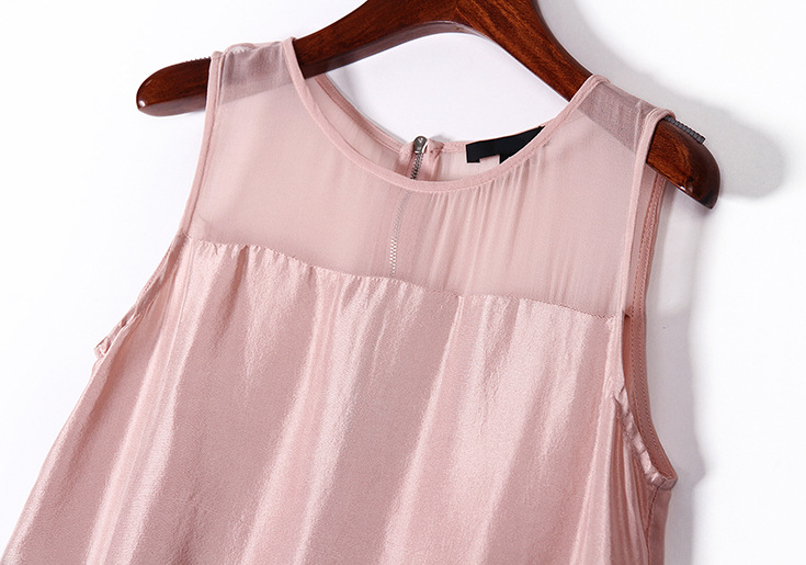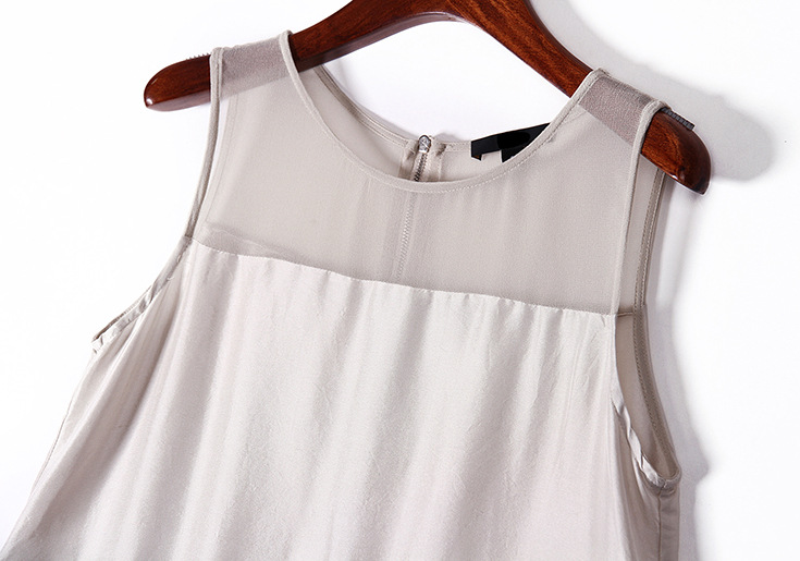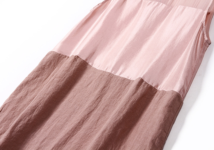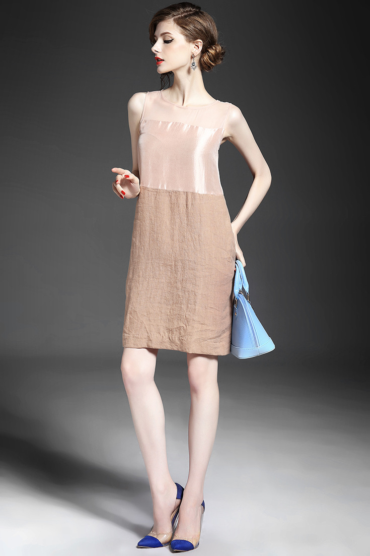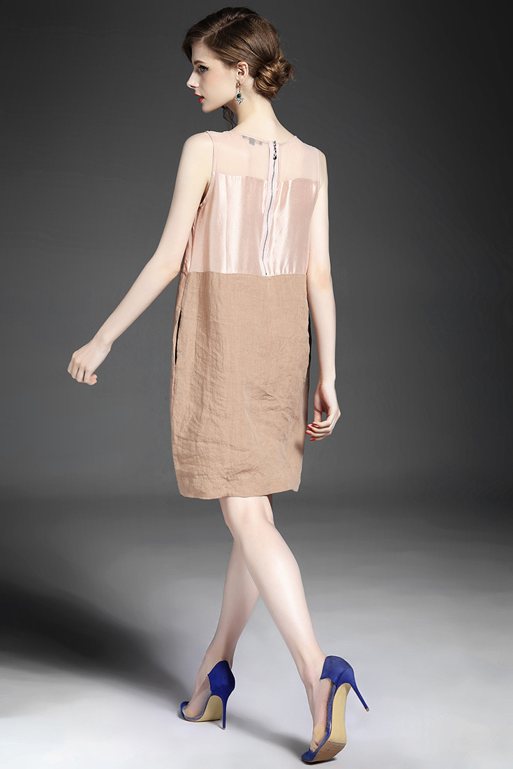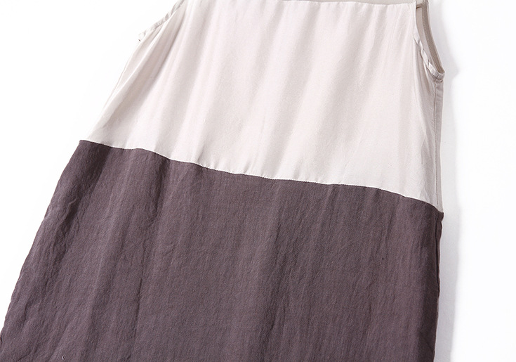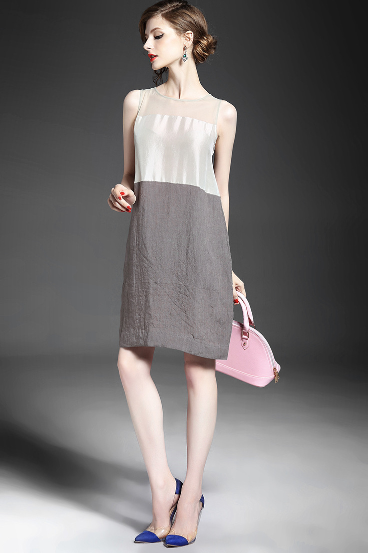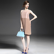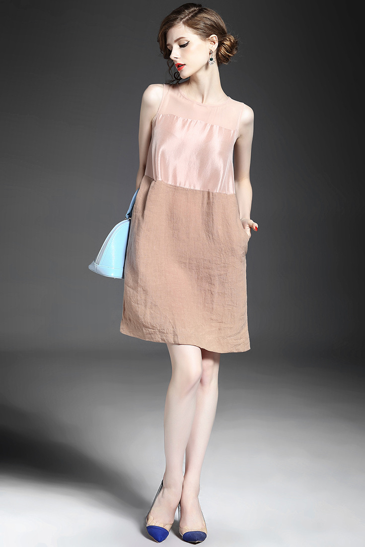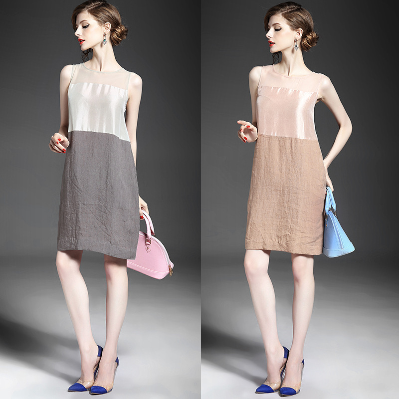 > 2015欧美女装夏季新款 无袖圆领气质拼接宽松娃娃裙亚麻连衣裙