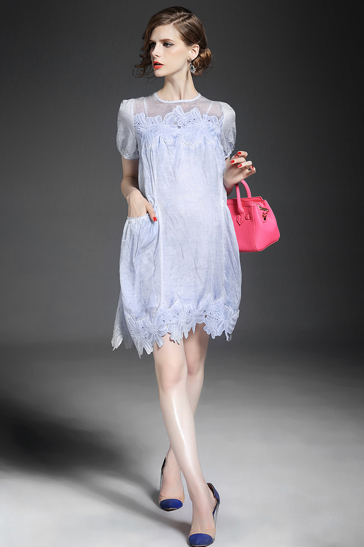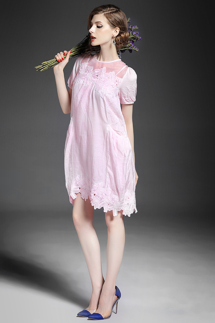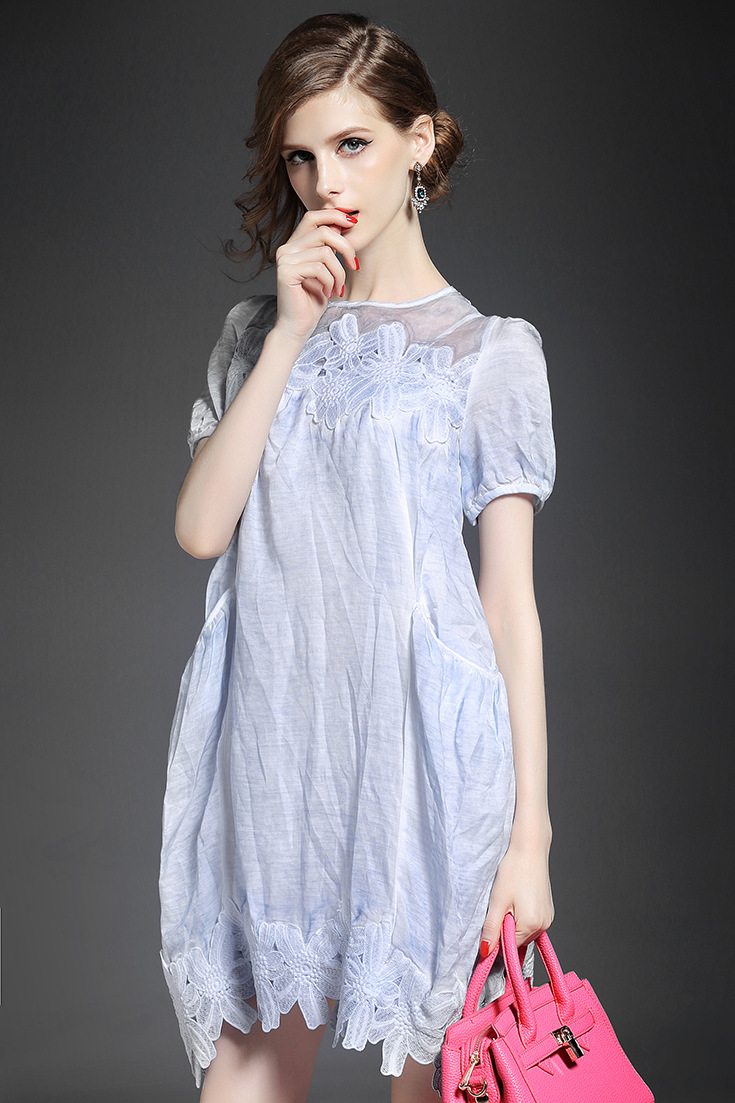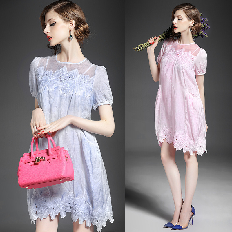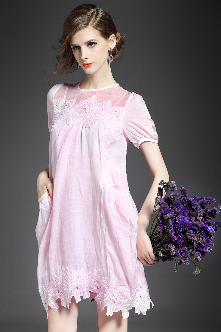 2015夏季新款 气质淑女圆领纯色不规则绣花拼接宽松连衣裙