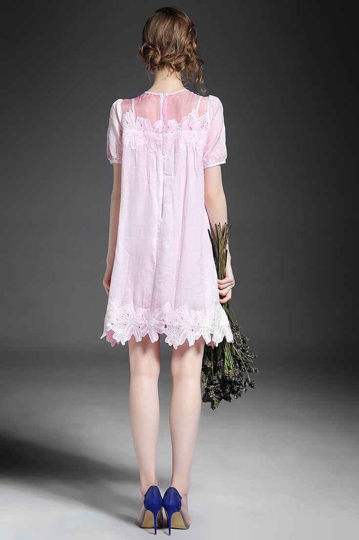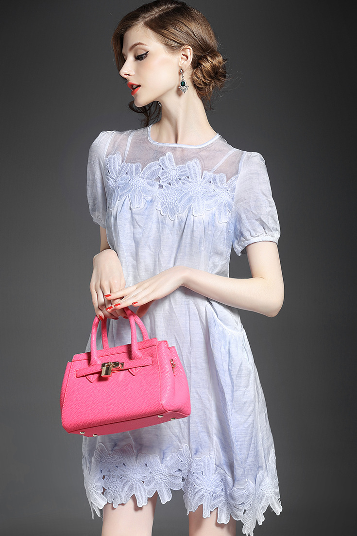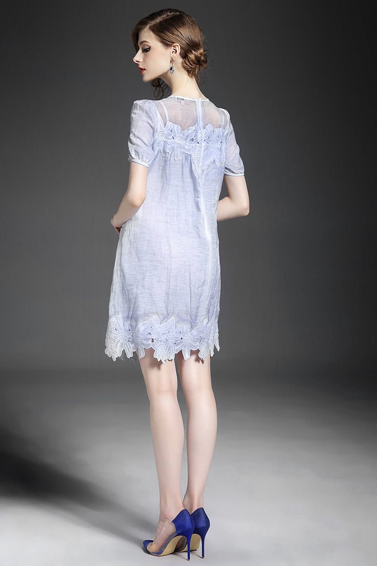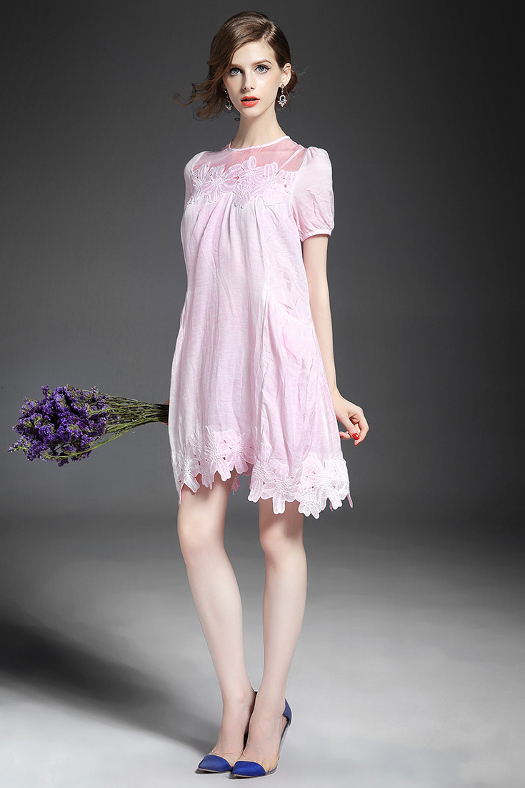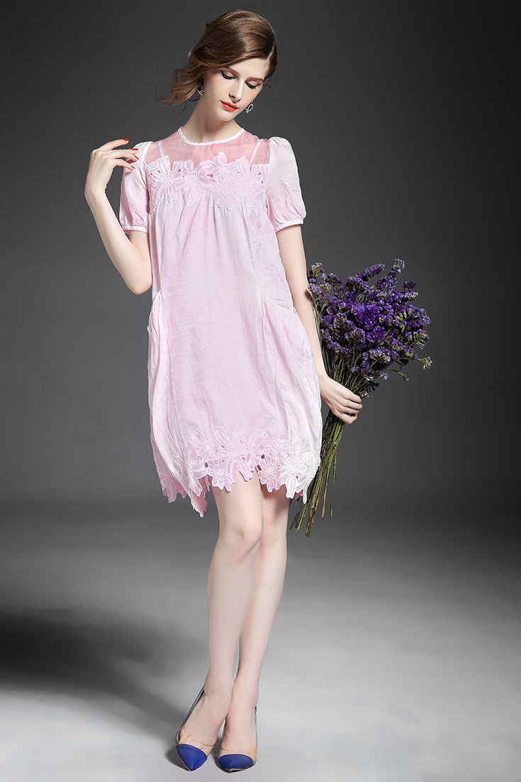 2015夏季新款 气质淑女圆领纯色不规则绣花拼接宽松连衣裙