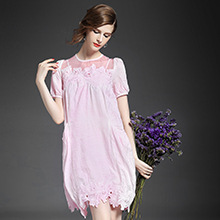 > 2015夏季新款 气质淑女圆领纯色不规则绣花拼接宽松连衣裙