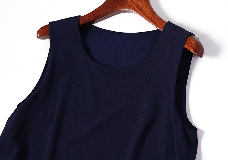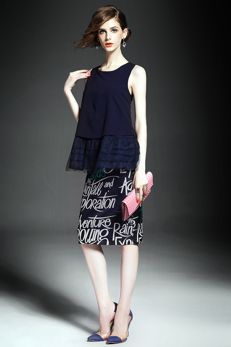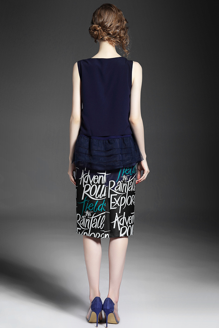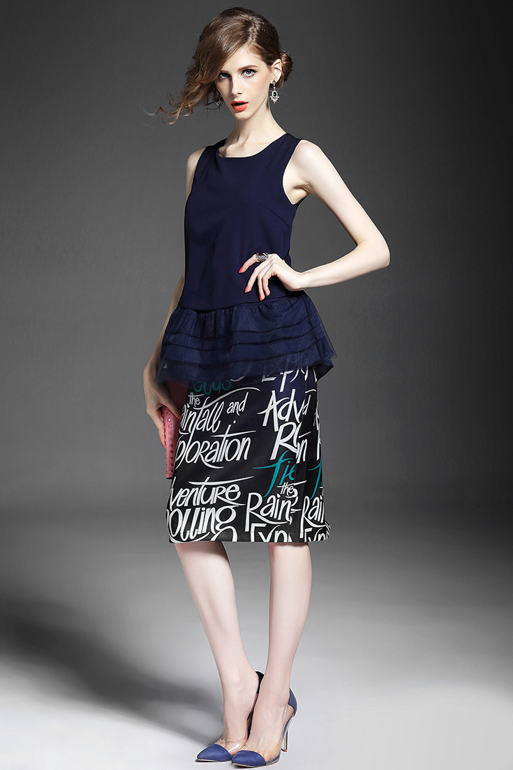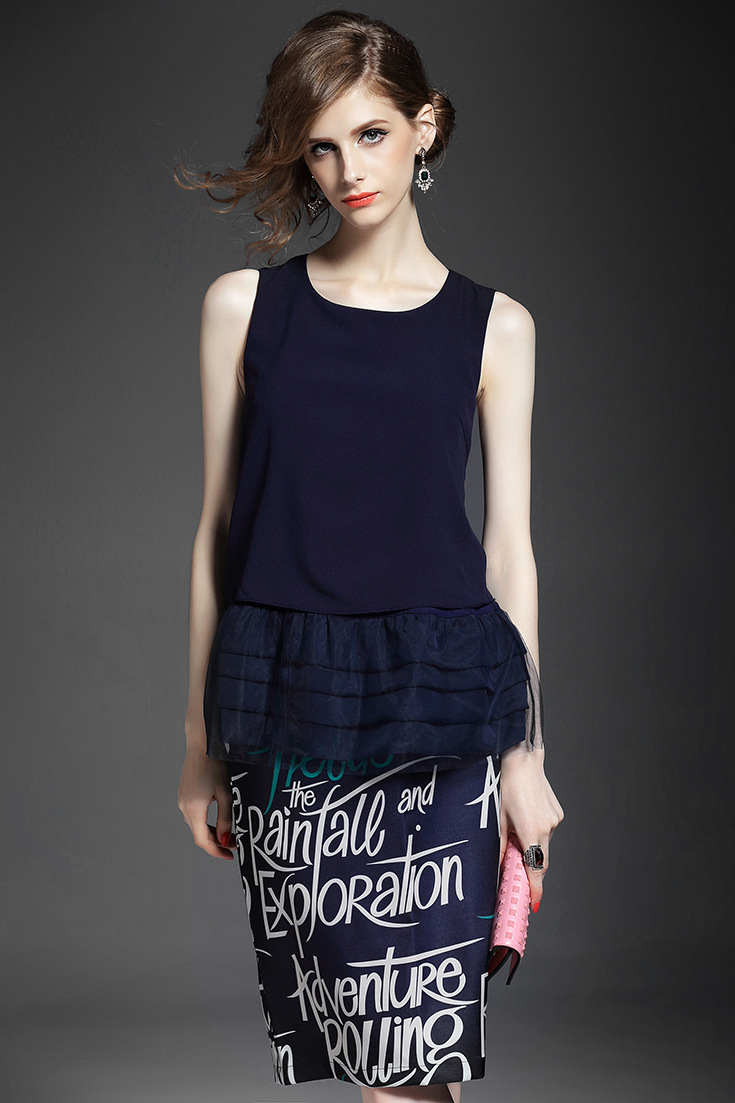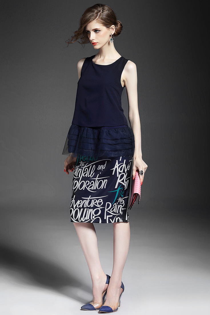 2015夏季女装新款 时尚圆领无袖拼接纱网压褶上衣+字母印花包臀裙