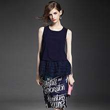> 2015夏季女装新款 时尚圆领无袖拼接纱网压褶上衣+字母印花包臀裙