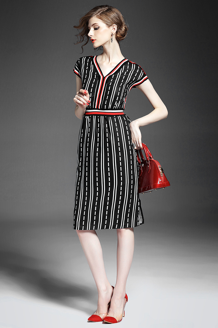 2015欧美品牌女装夏季新款 气质V领包肩袖条纹弹力收腰修身连衣裙