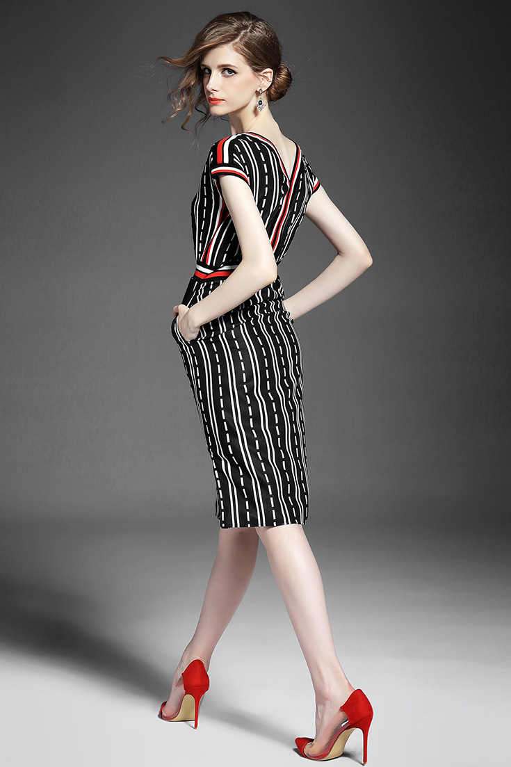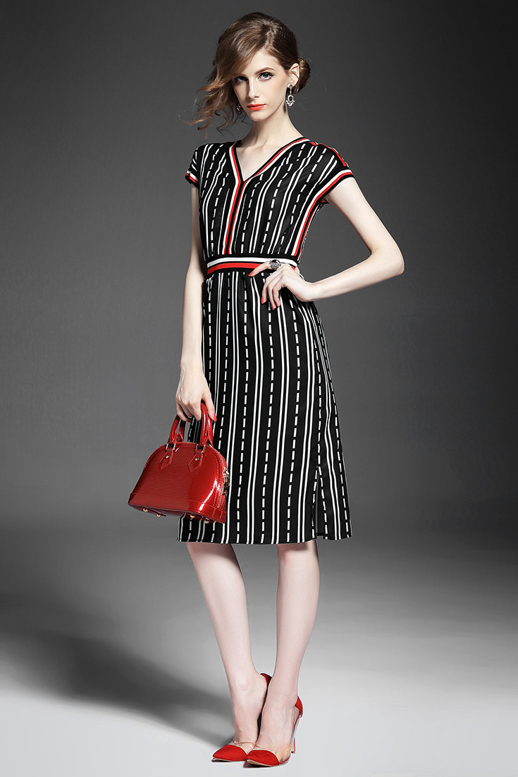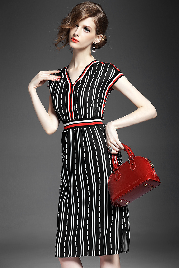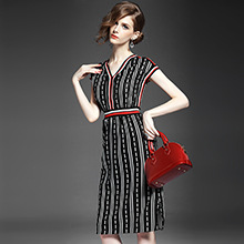 > 2015欧美品牌女装夏季新款 气质V领包肩袖条纹弹力收腰修身连衣裙