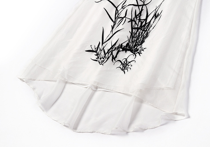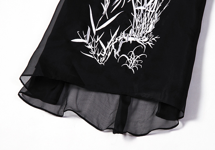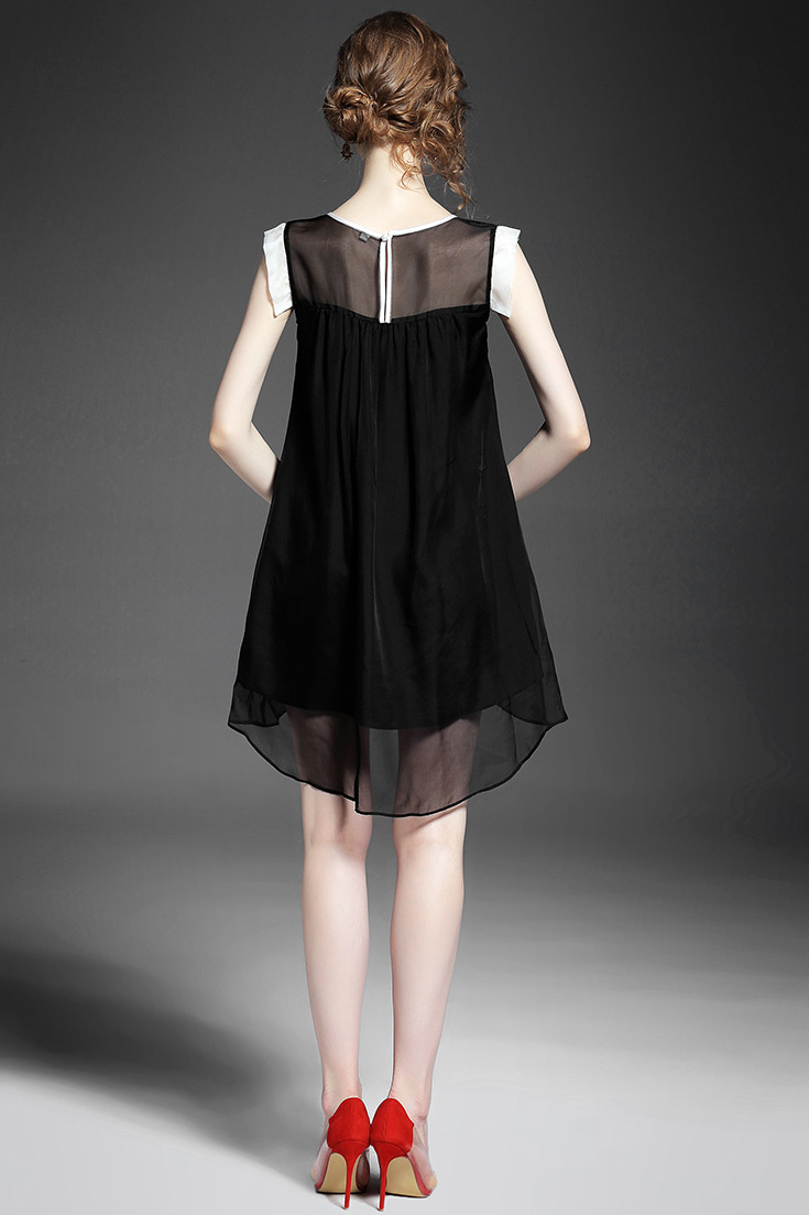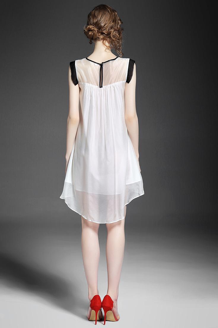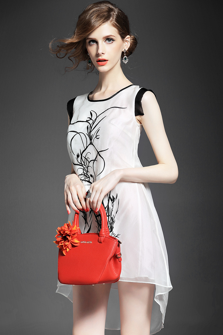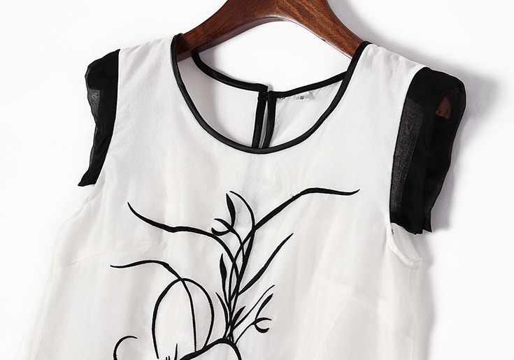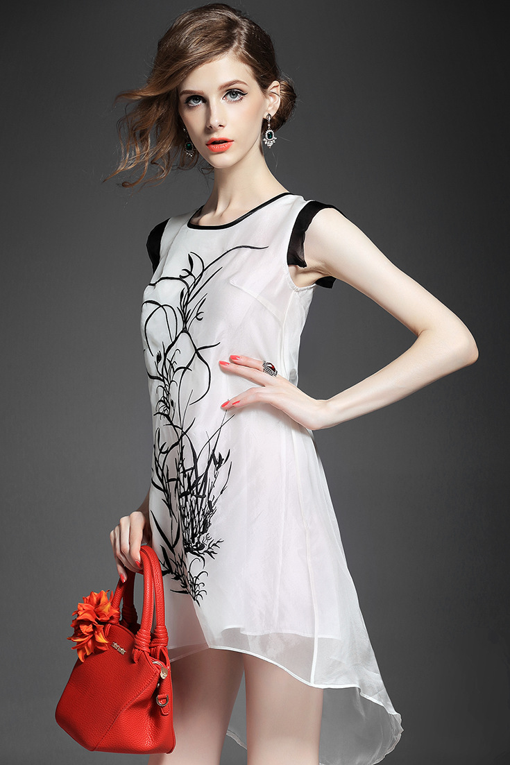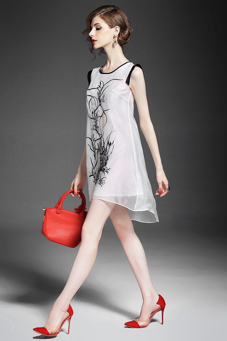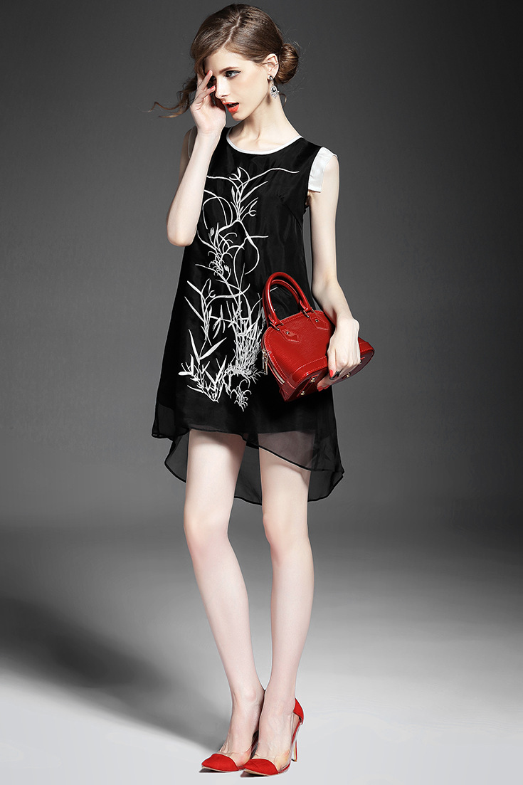> 2015夏季女装新款 时尚圆领无袖植物刺绣不规则真丝连衣裙