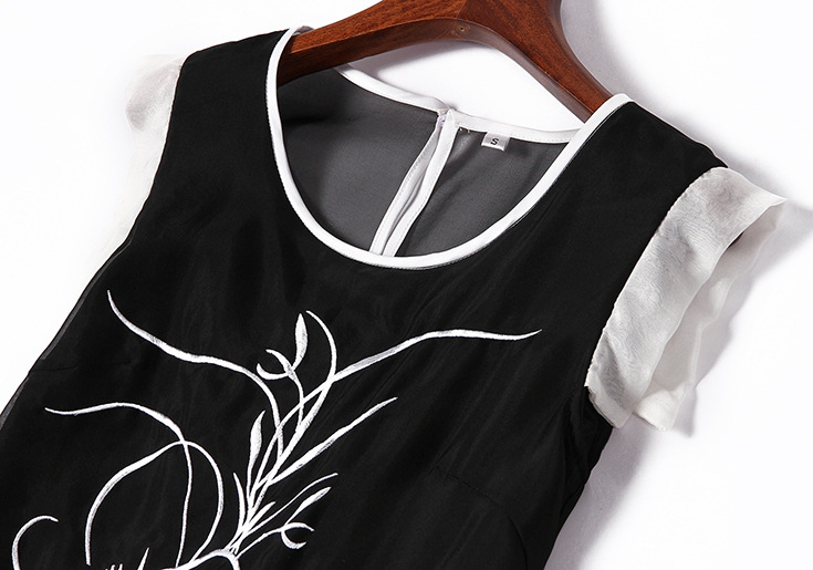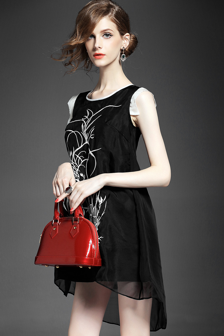 2015夏季女装新款 时尚圆领无袖植物刺绣不规则真丝连衣裙