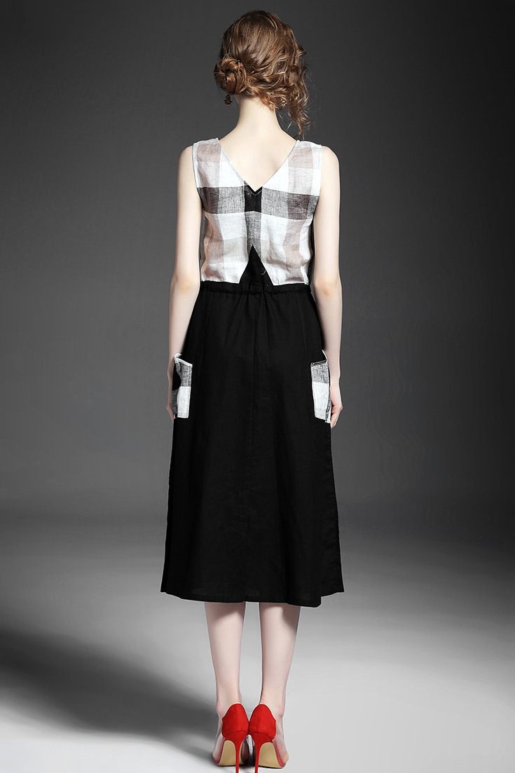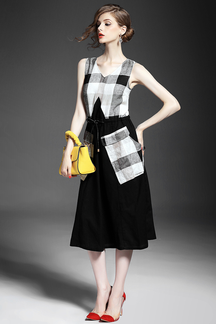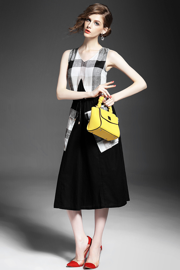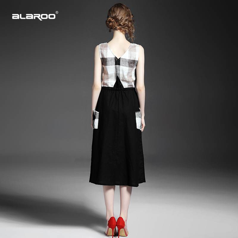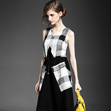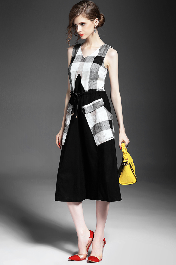 > 2015夏季欧美新款 时尚V领方格撞色条纹无袖拼接收腰修身连衣裙