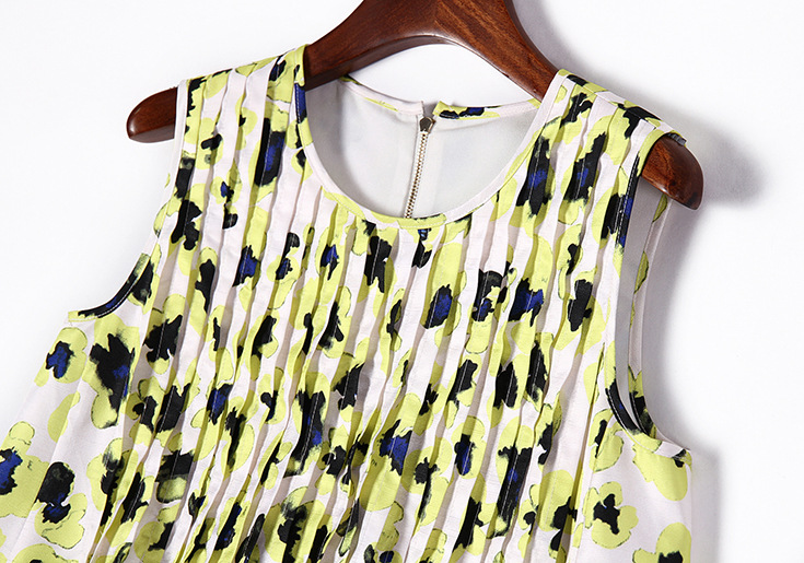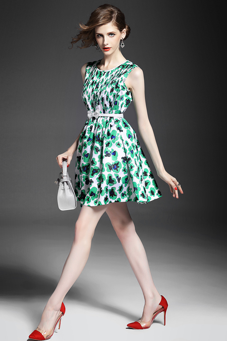 > 女装2015夏季新款 气质圆领无袖印花压褶收腰修身a字裙送腰带