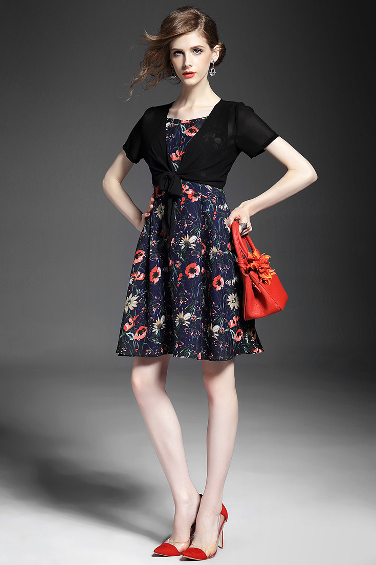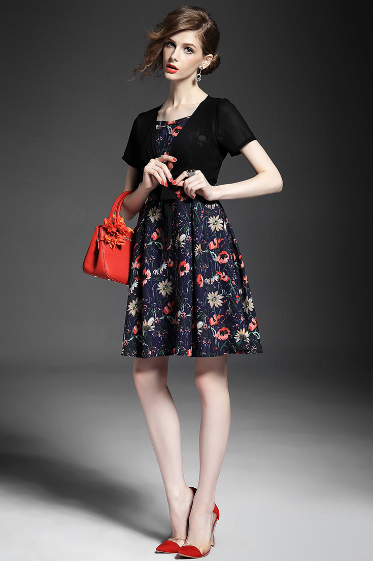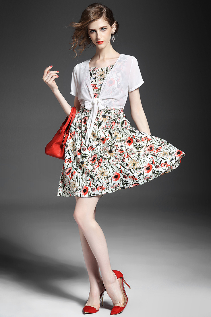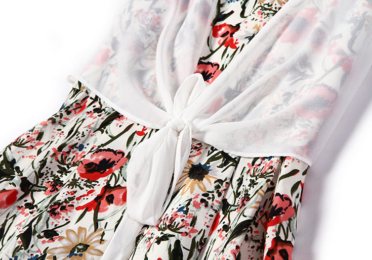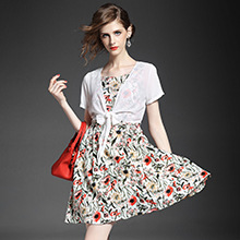 > 2015欧美圆领亚麻印花修身大摆a字裙+纯色雪纺披肩两件套夏新款