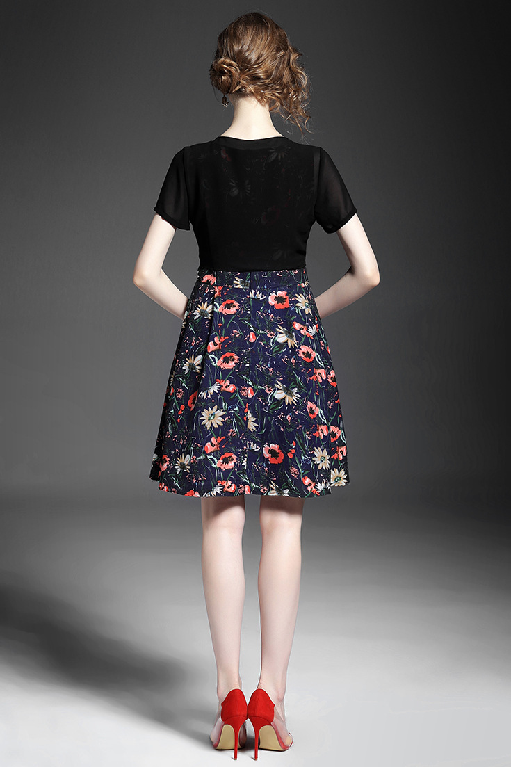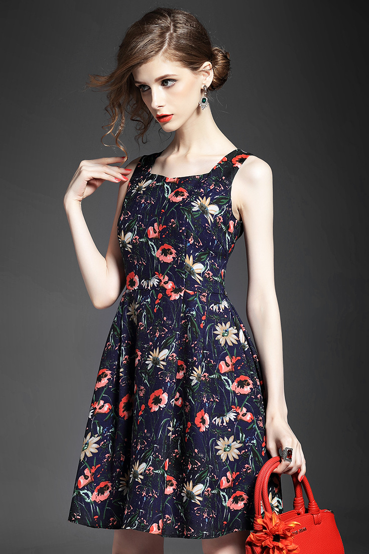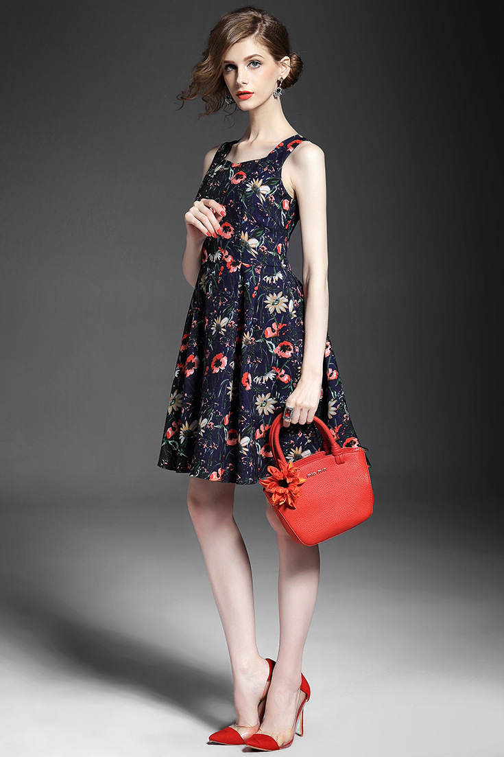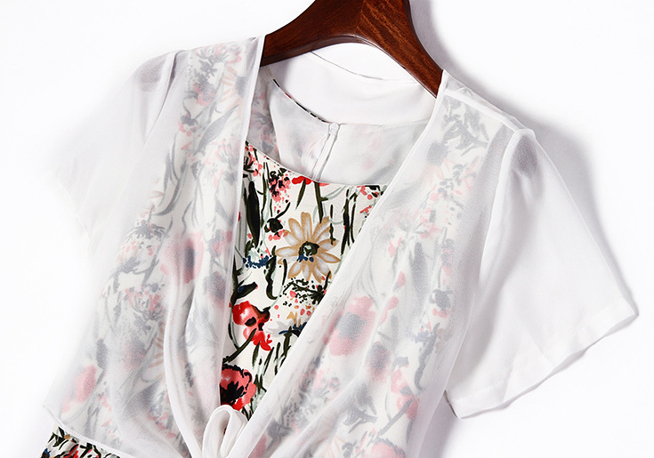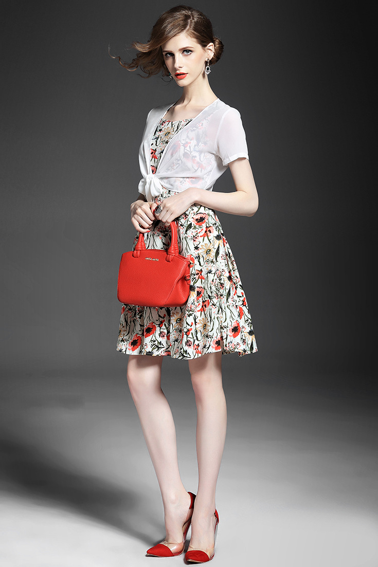 > 2015欧美圆领亚麻印花修身大摆a字裙+纯色雪纺披肩两件套夏新款