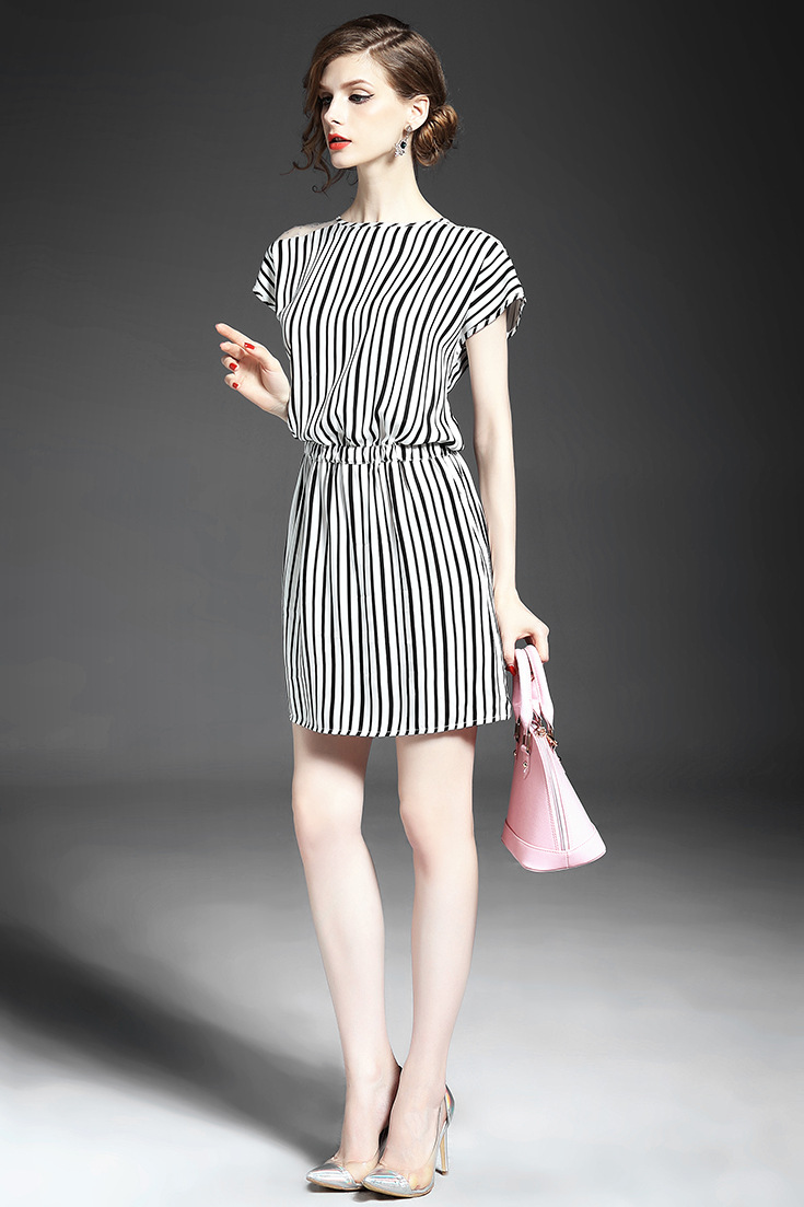 > 2015夏季新款女装 欧美圆领钉珠拼接竖条纹弹力收腰铜氨丝连衣裙
