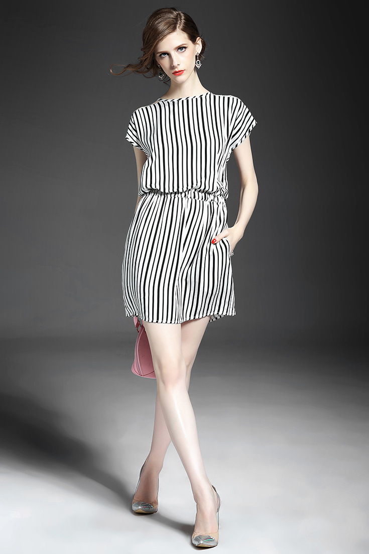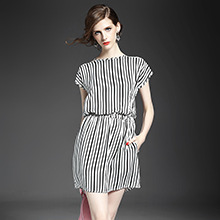 2015夏季新款女装 欧美圆领钉珠拼接竖条纹弹力收腰铜氨丝连衣裙