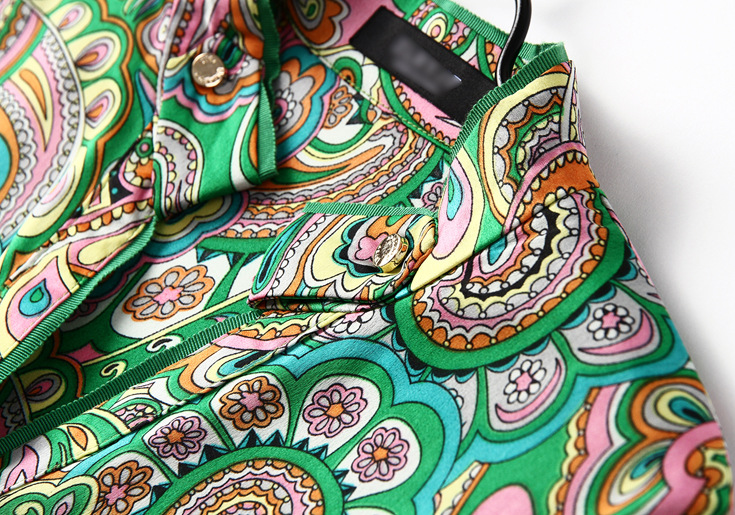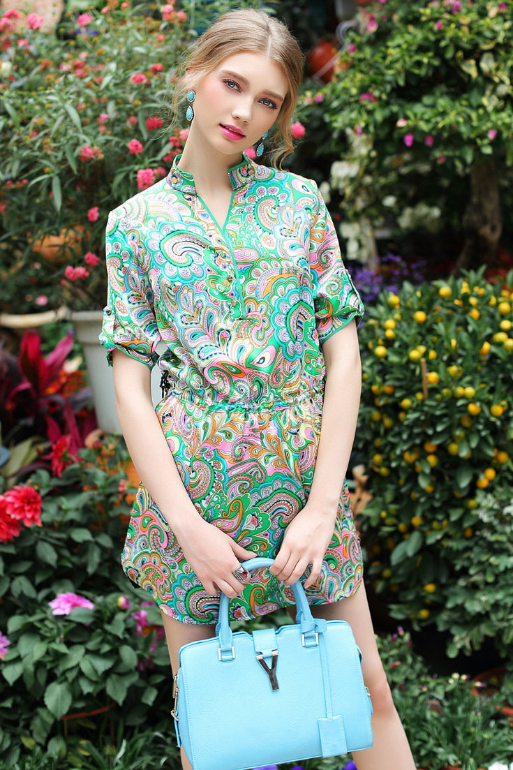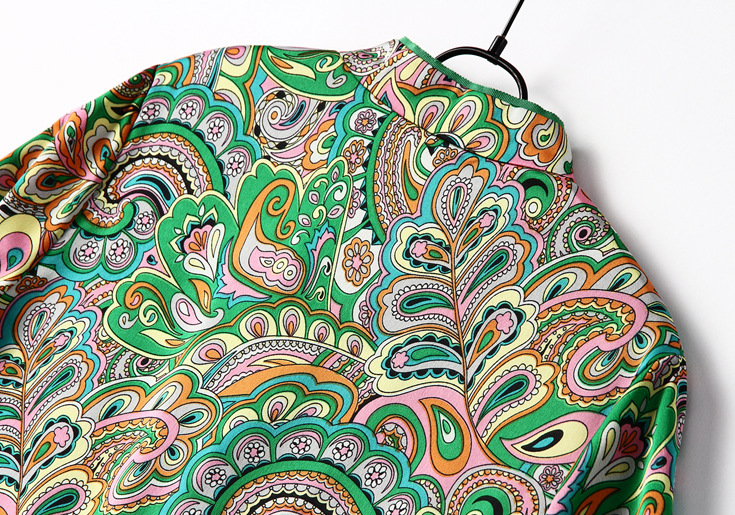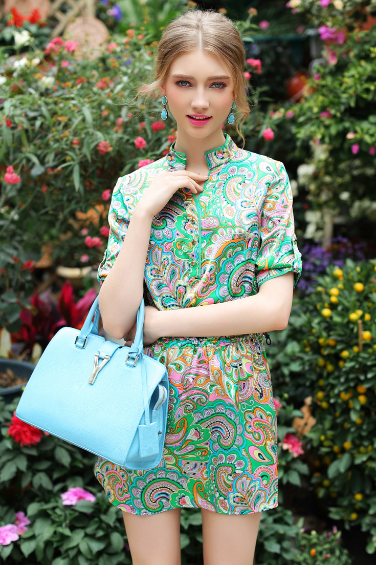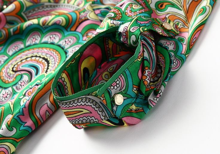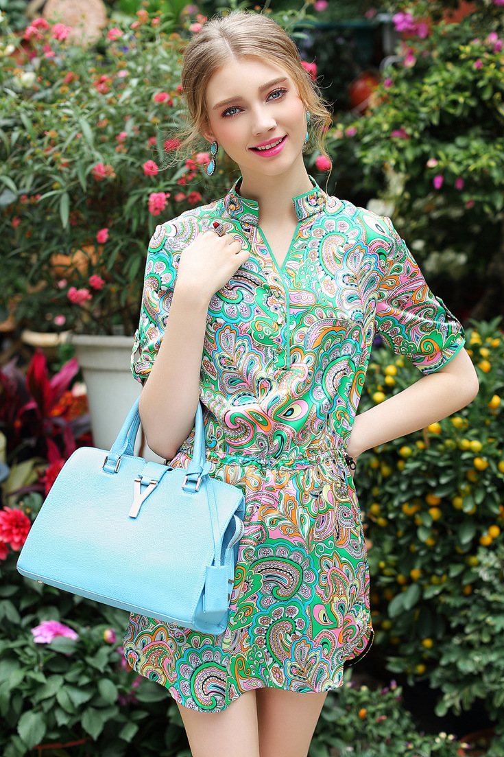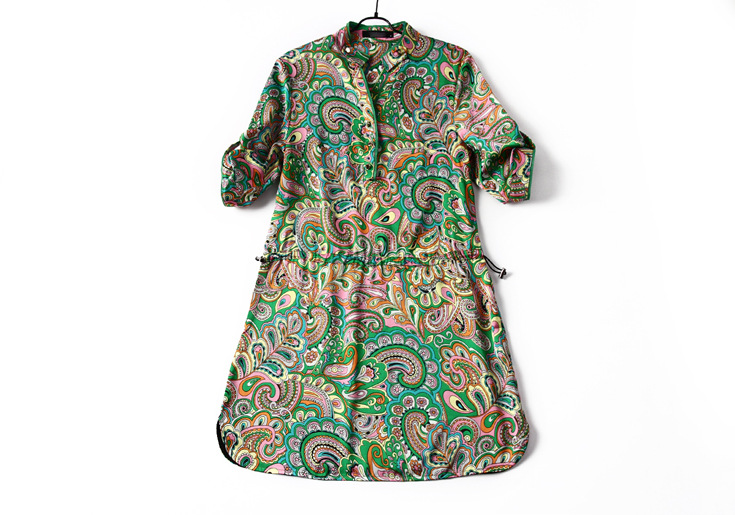 2015春夏季新款欧美风印花真丝连衣裙七分袖衬衣领时尚A字裙