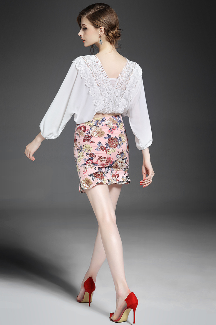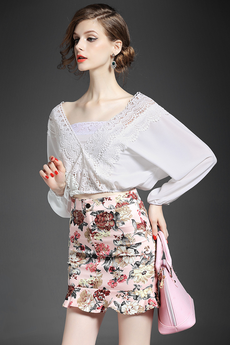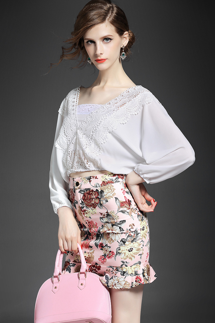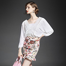 2015夏季女装 欧美大牌袖口蕾丝拼贴短袖T恤+印花半裙两件套