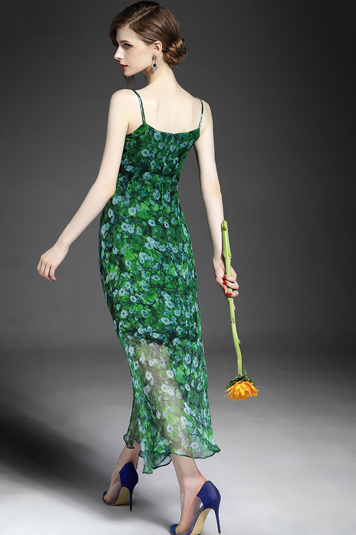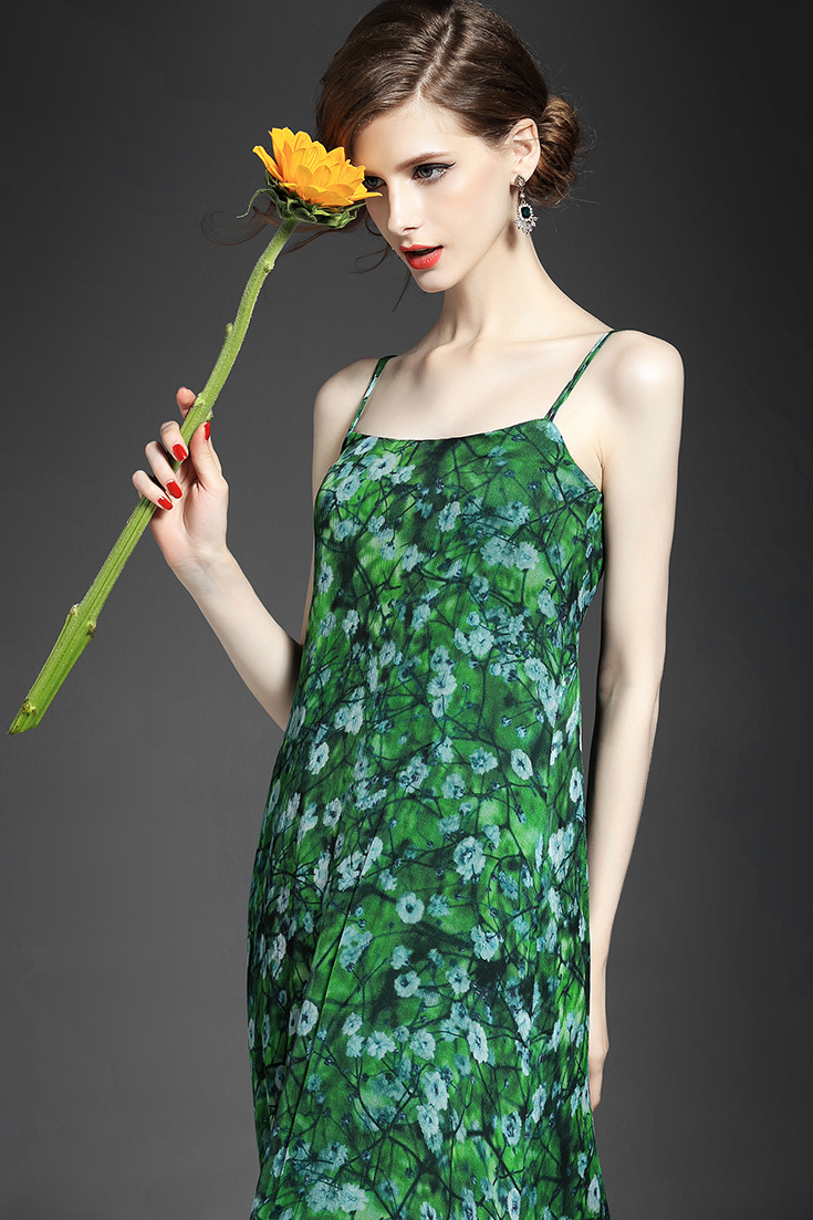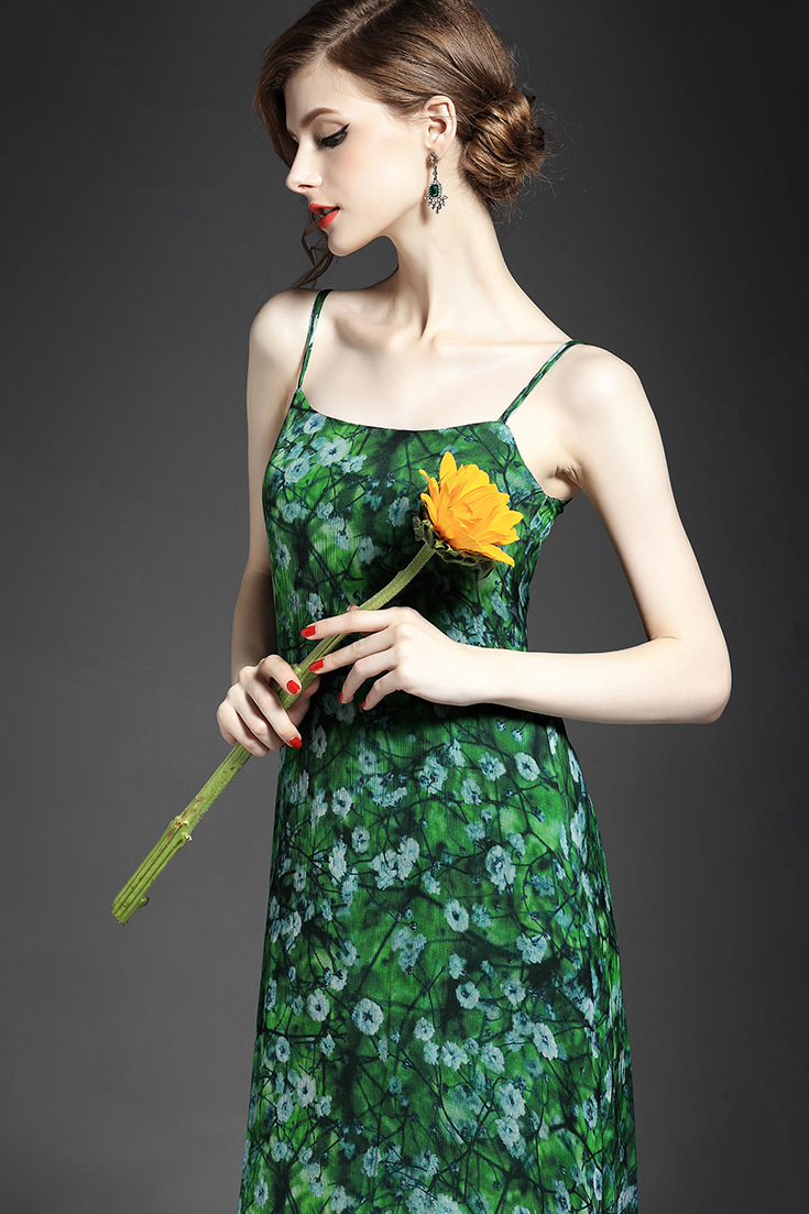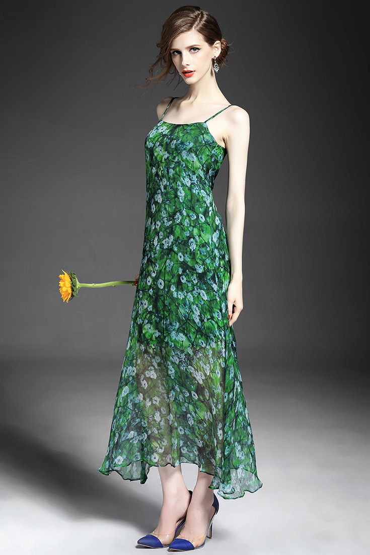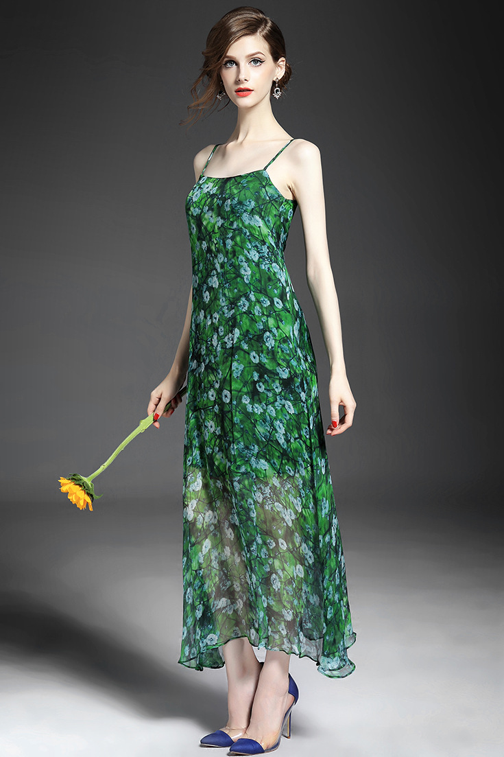 > 2015夏季女装新款 欧美大牌碎花不规则大摆真丝长裙吊带沙滩裙