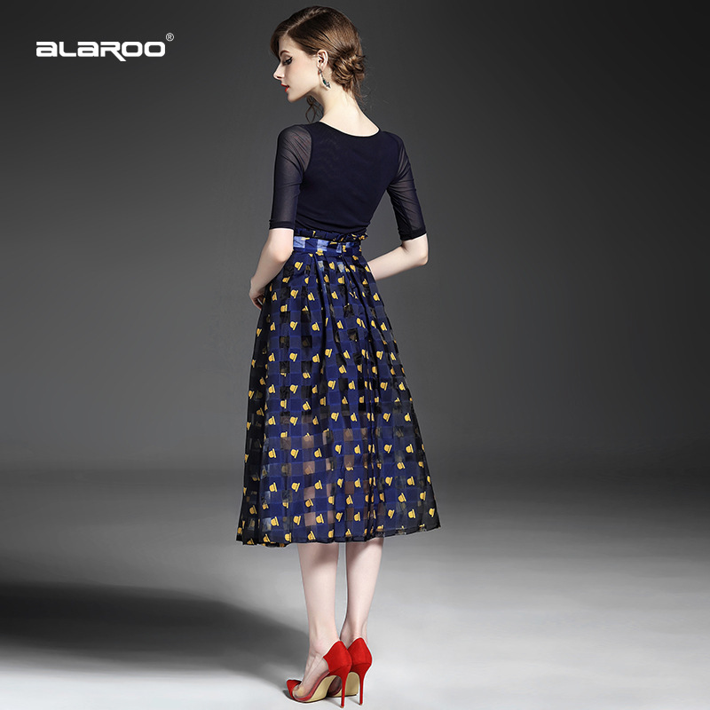 2015夏季女装 欧美大牌袖口蕾丝拼贴短袖T恤+印花半裙两件套