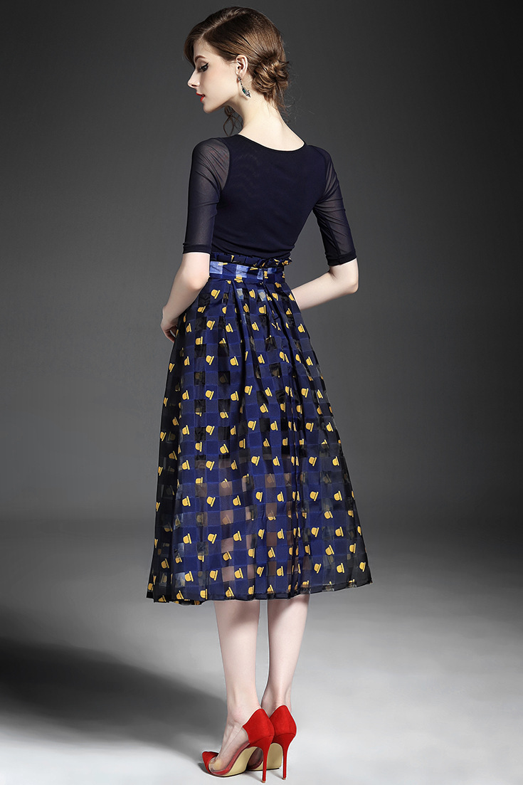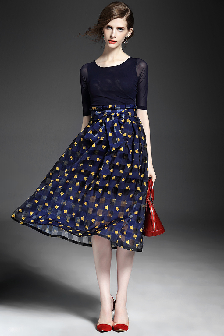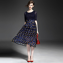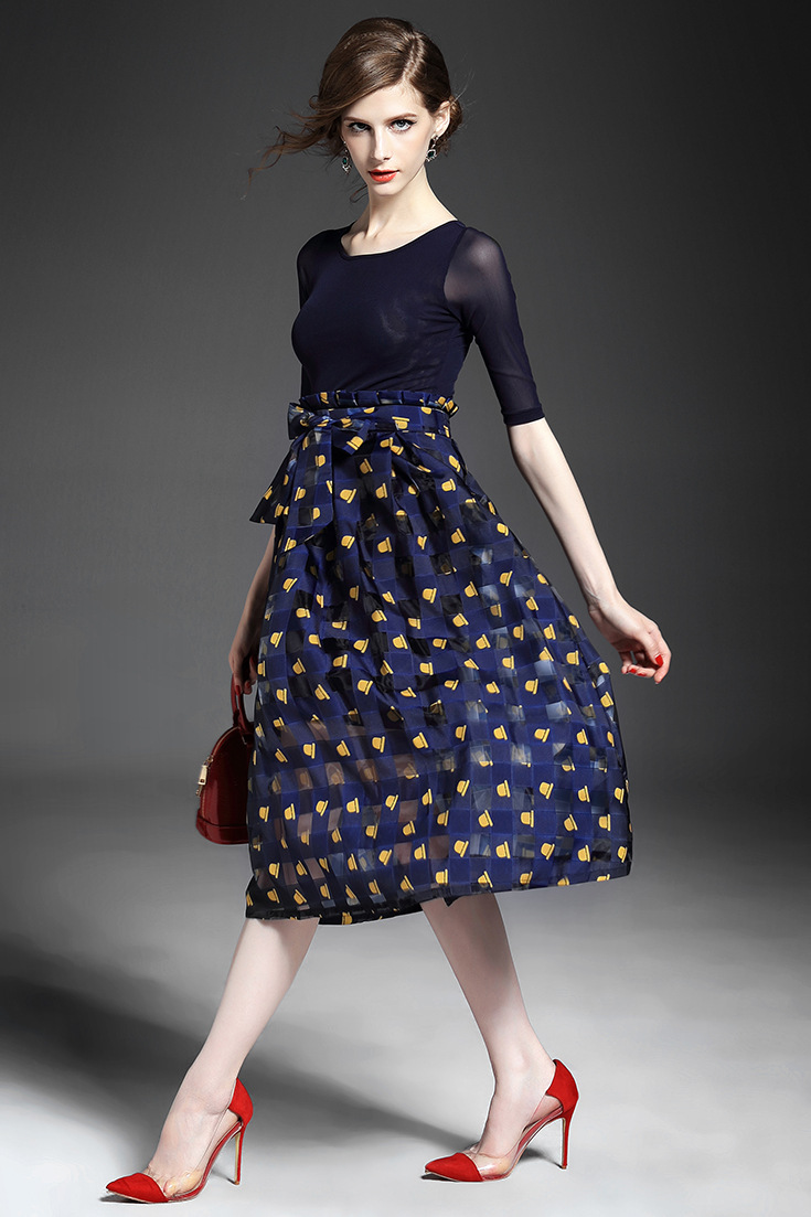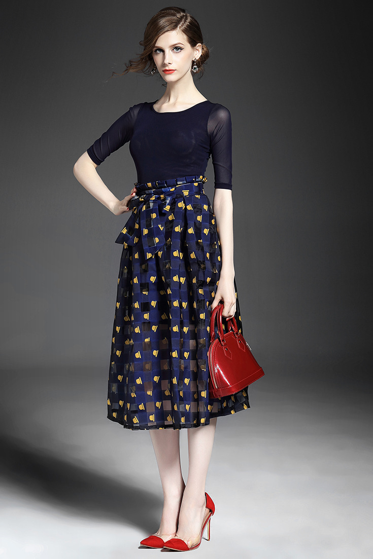 2015夏 圆领水溶绣花钉钻纯色上衣+弹力修身印花蓬蓬半裙套装