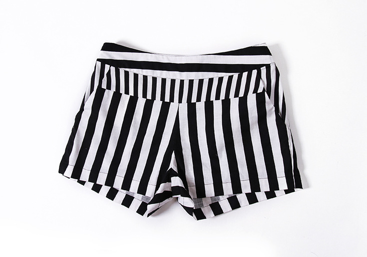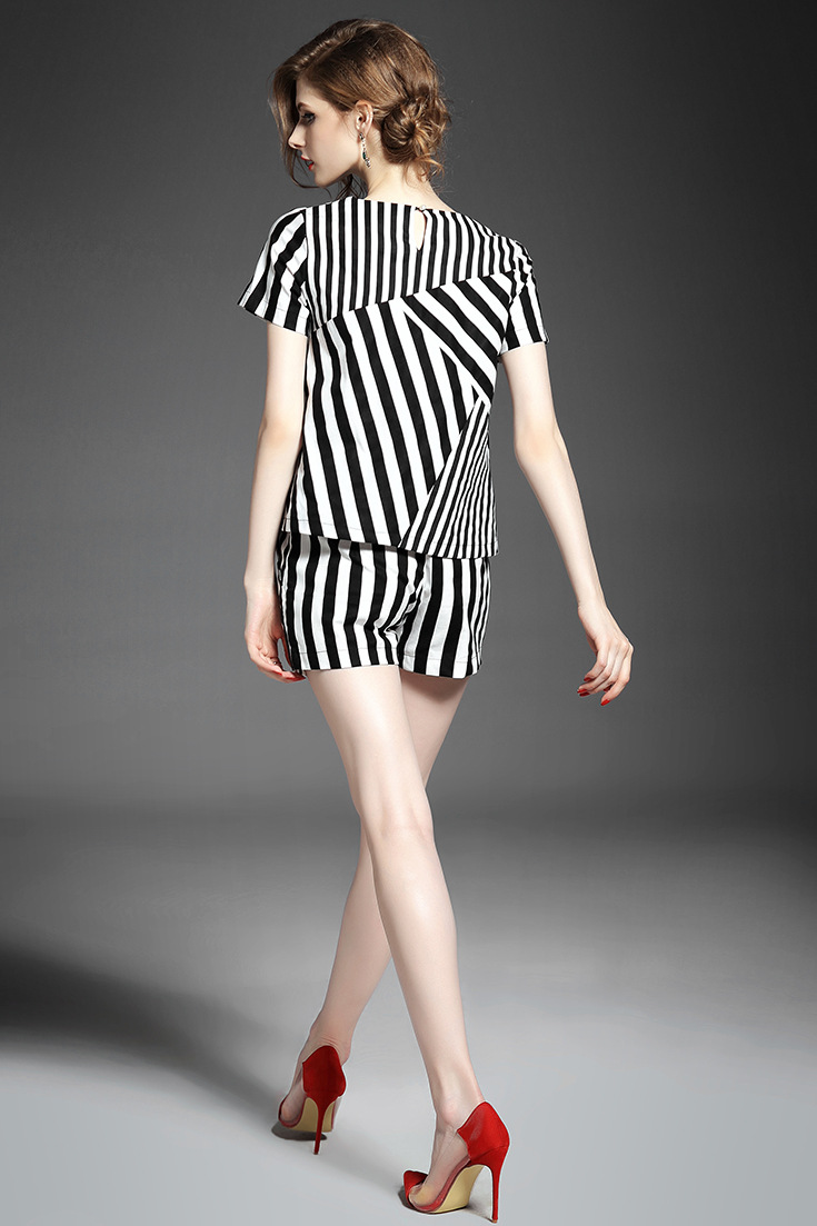 2015夏 欧美时尚不规则后背开叉真丝拼接条纹上衣+阔腿短裤套装