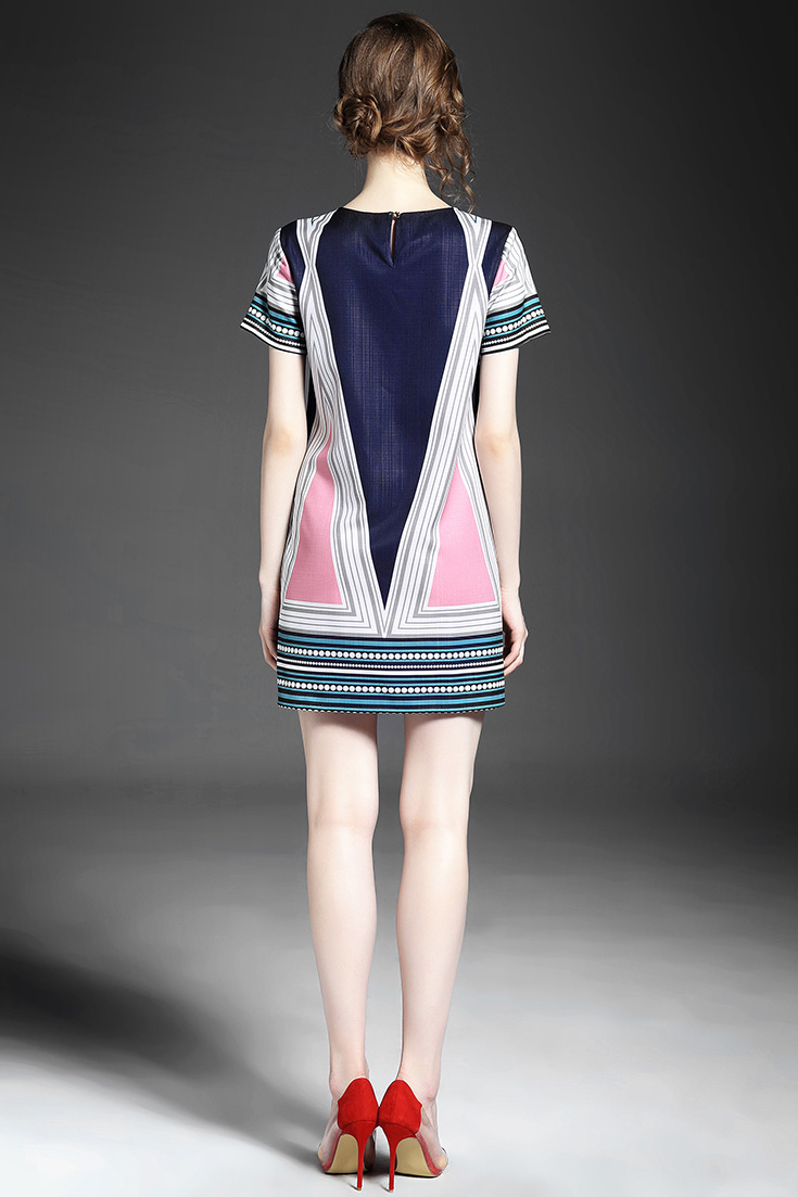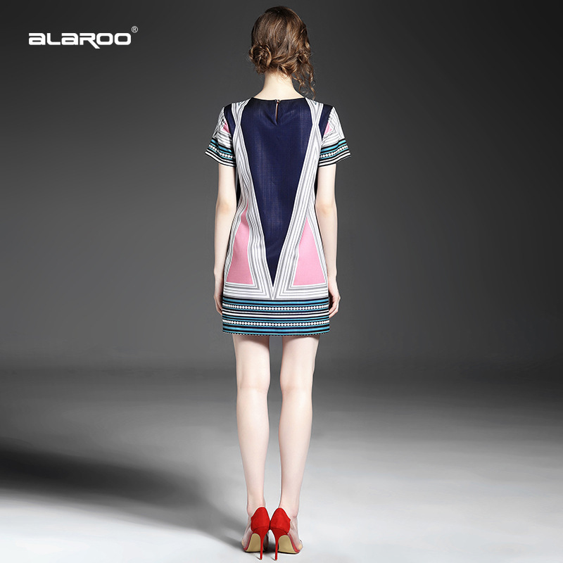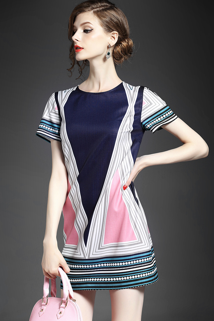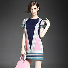 2015欧洲站品质女装 圆领亚麻印花撞色套头宽松连衣裙