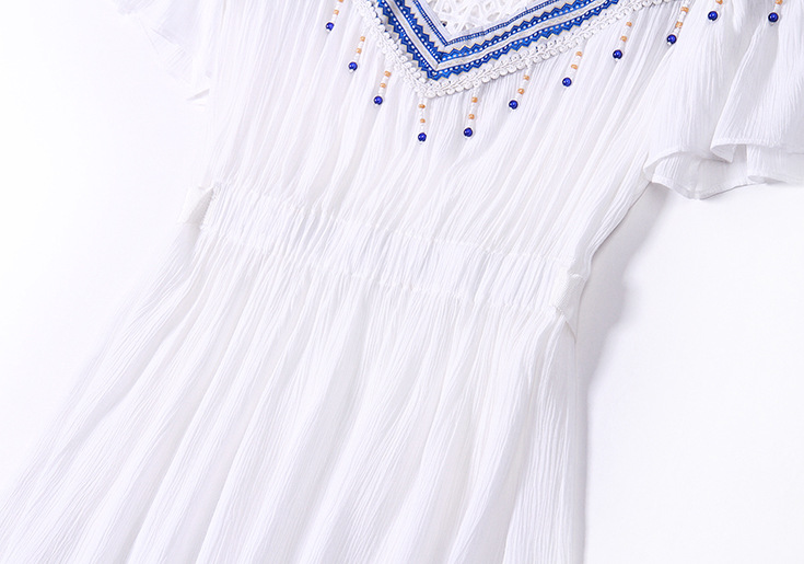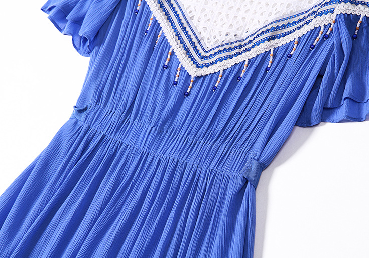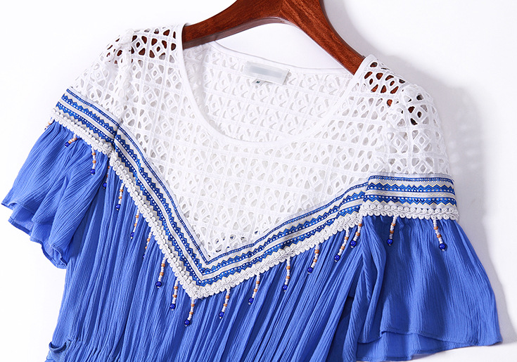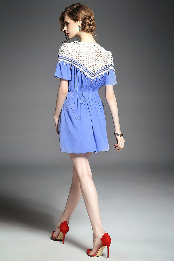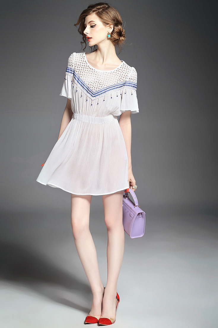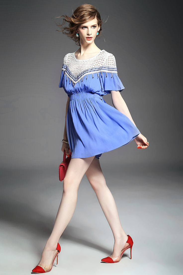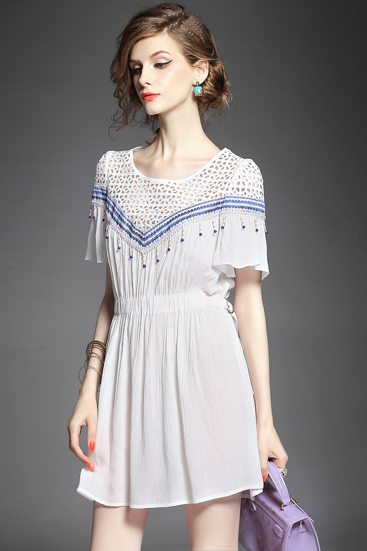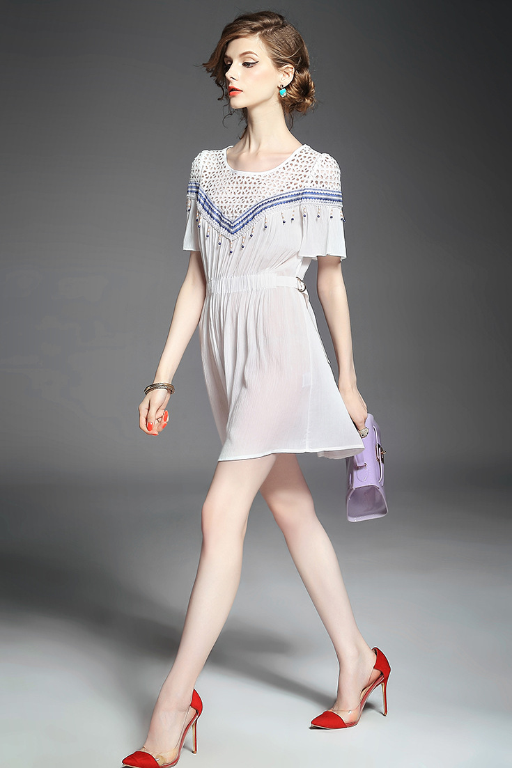 > 2015欧美大牌钉珠喇叭袖重工绣花镂空弹力收腰修身a字裙短裙夏