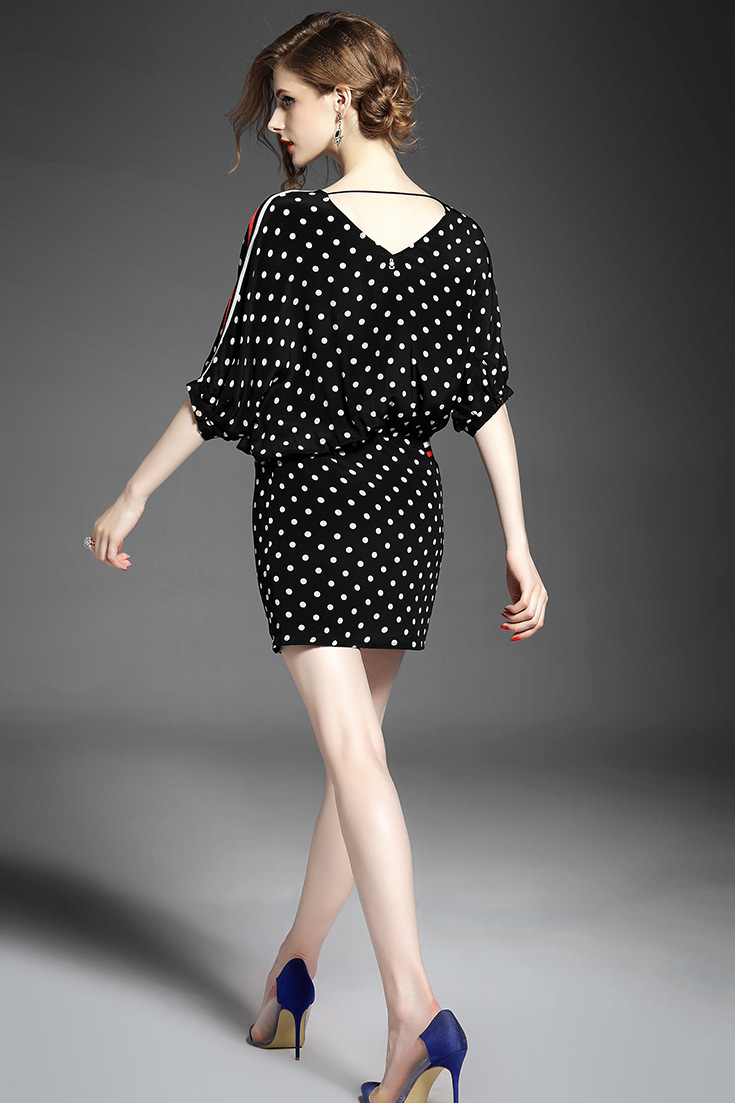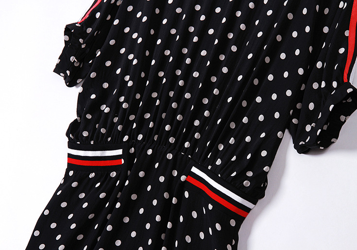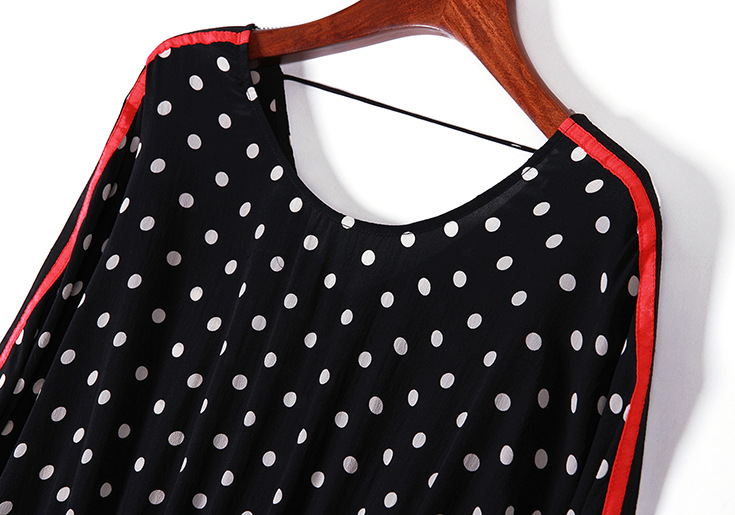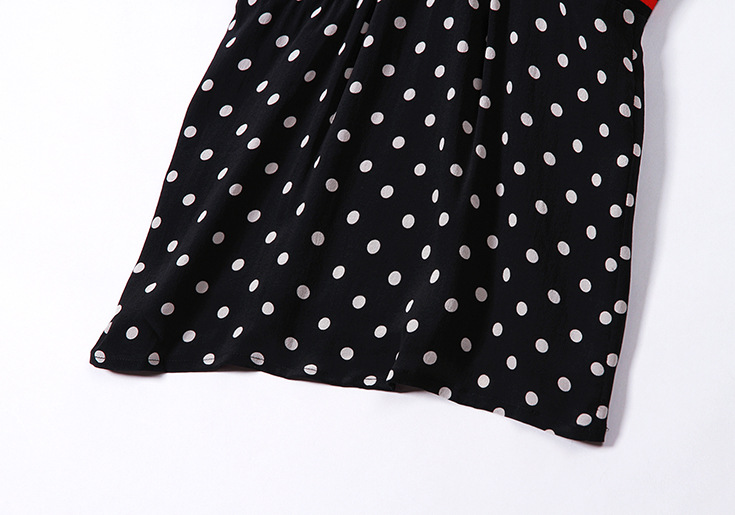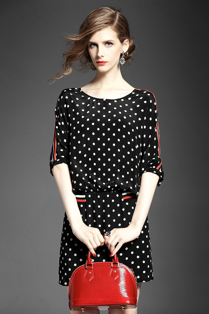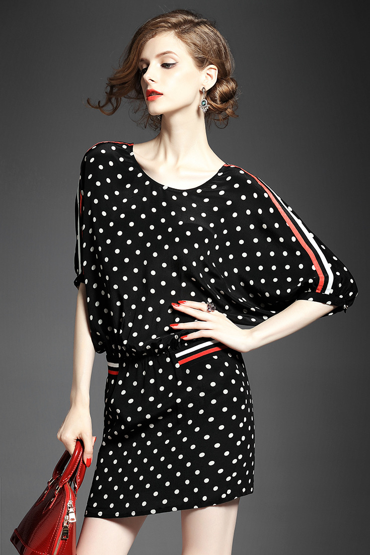 2015欧美女装气质波点条纹拼接弹力收腰宽松套头桑蚕丝连衣裙夏