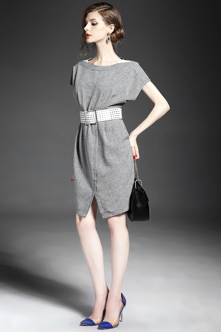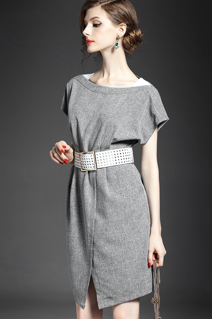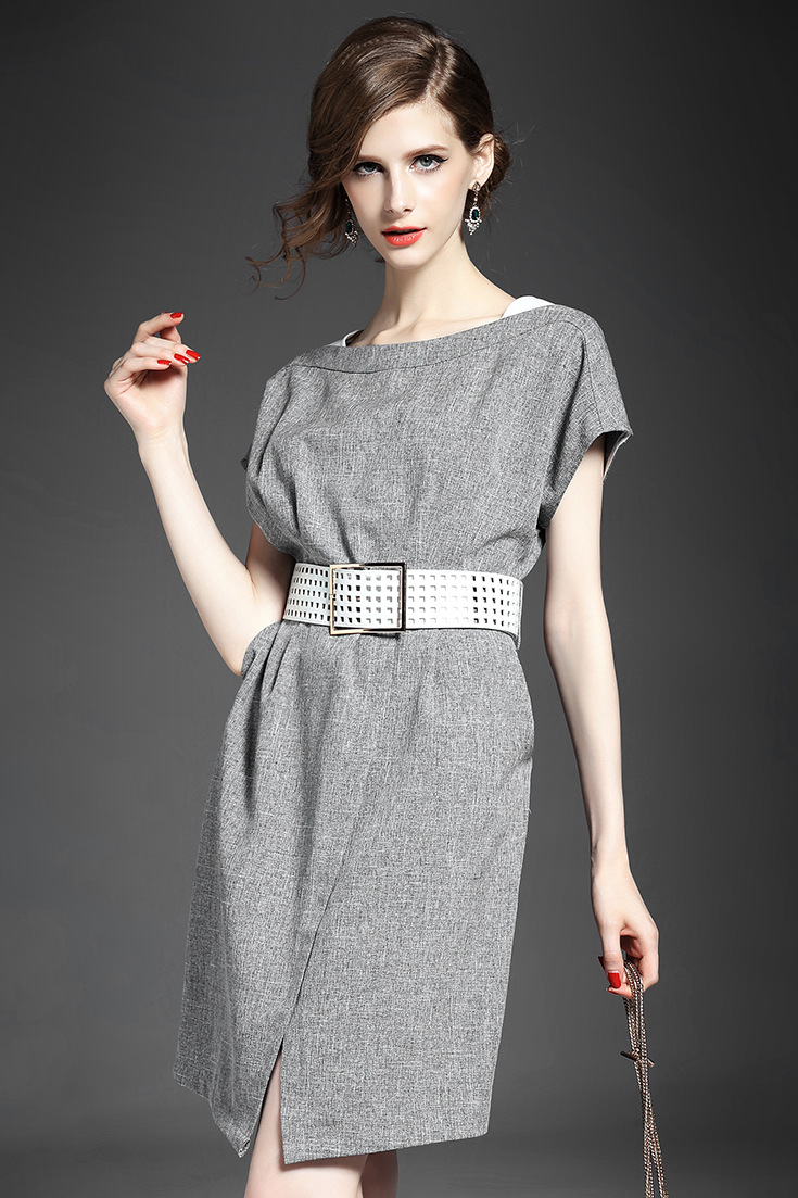 2015夏季新款女装 圆领落肩袖高腰修身下摆开叉纯色连衣裙送腰带