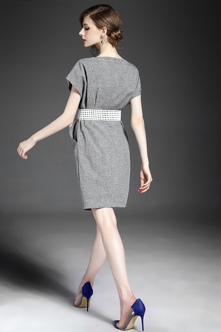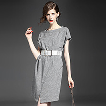 > 2015夏季新款女装 圆领落肩袖高腰修身下摆开叉纯色连衣裙送腰带