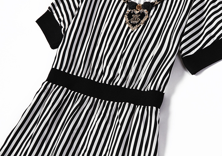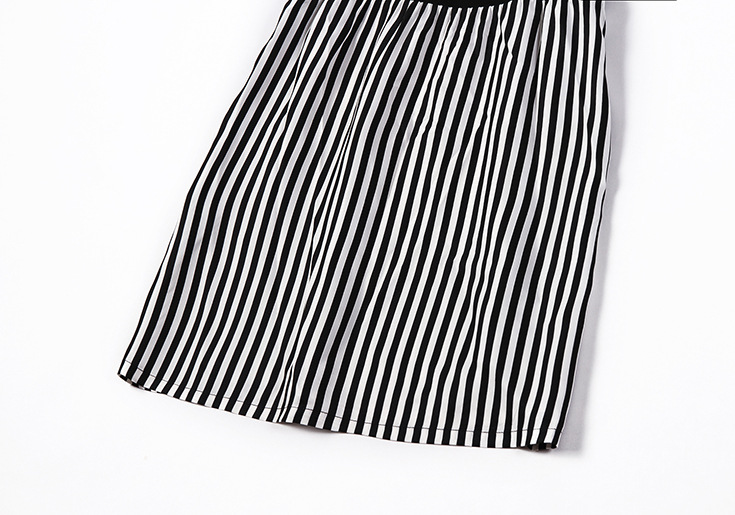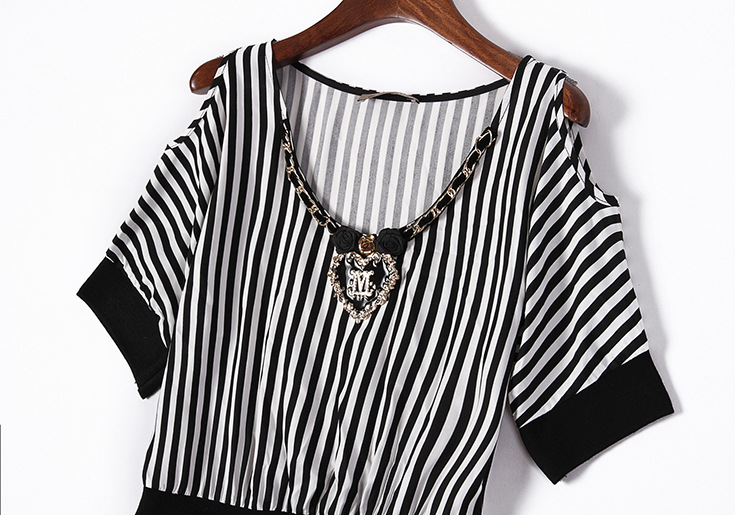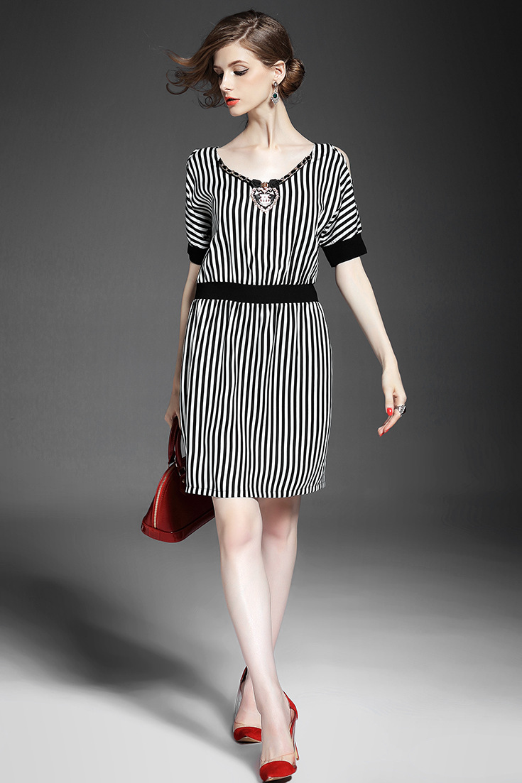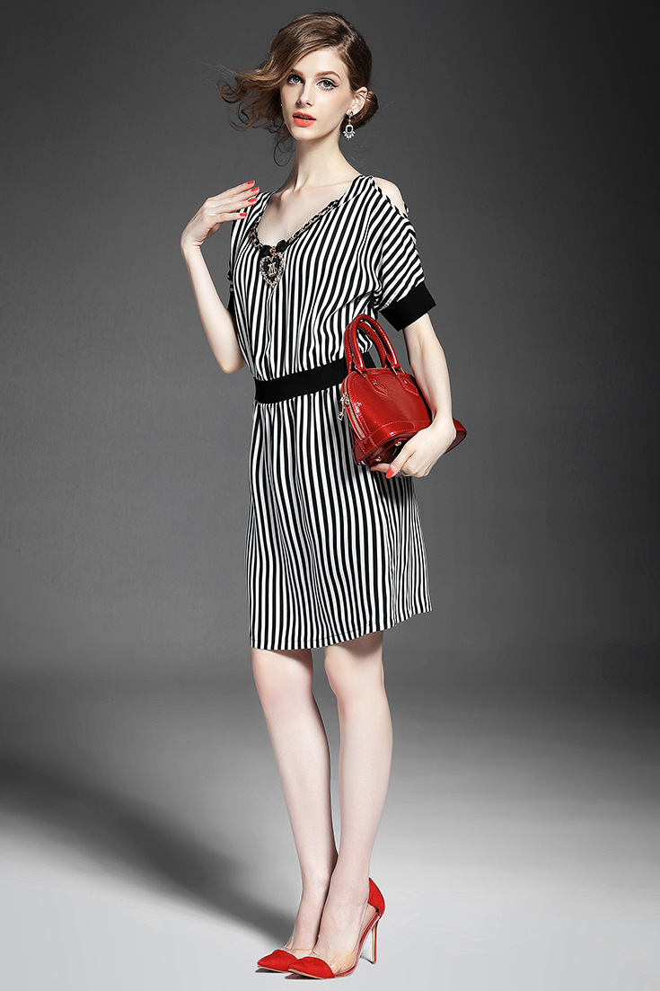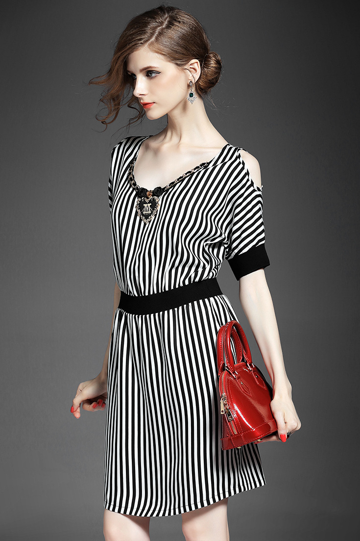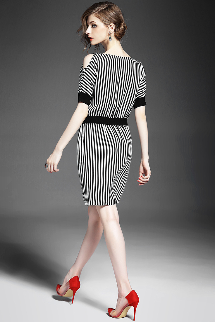> 2015夏季新款女装 欧美时尚V领露肩短袖黑白条纹修身显瘦连衣裙
