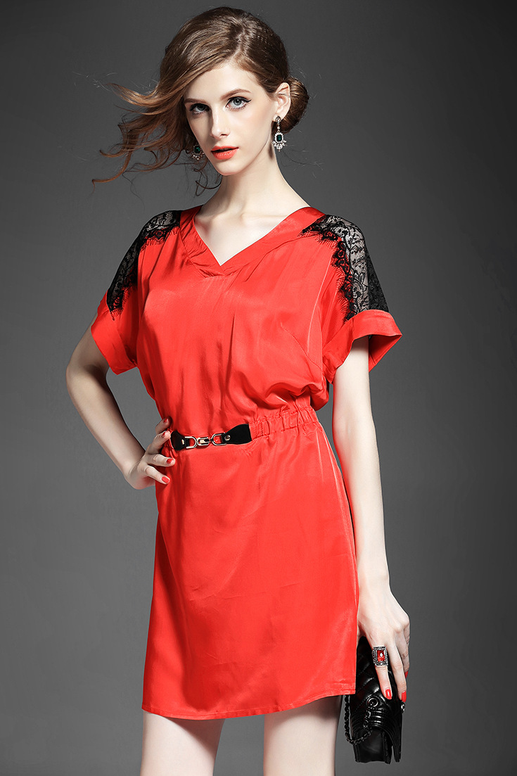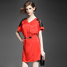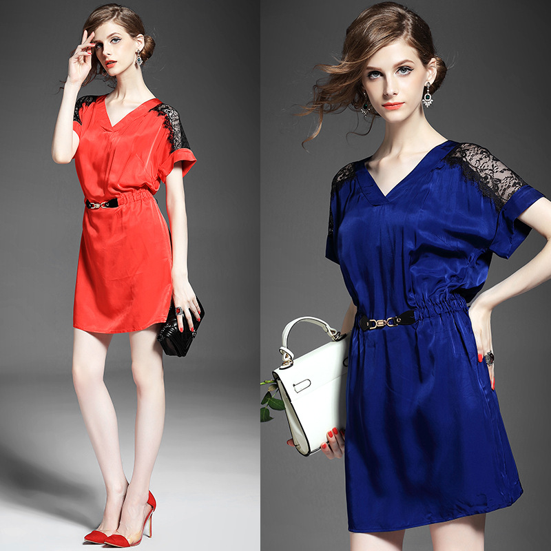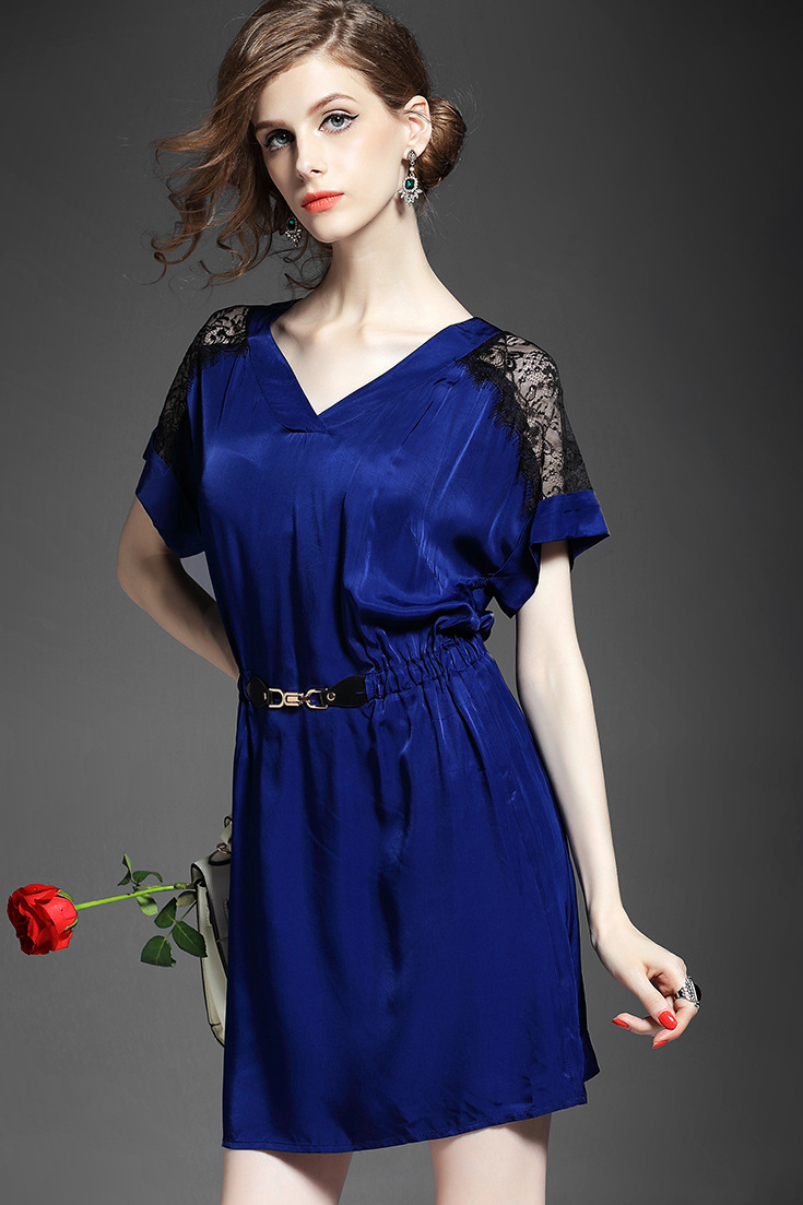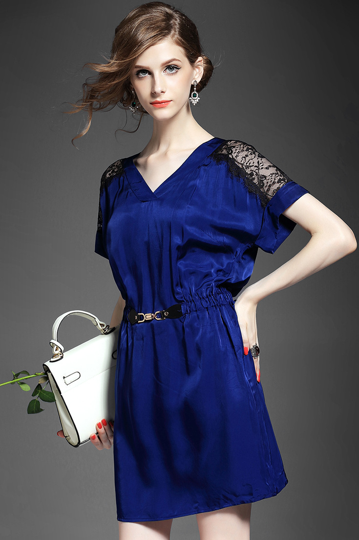 > 2015夏季新款女装 气质V领蕾丝拼接金属扣收腰修身连衣裙