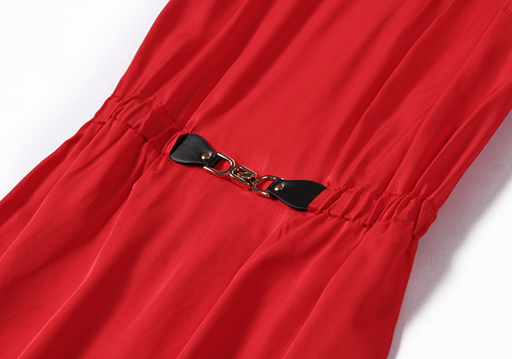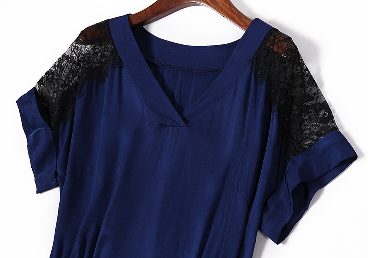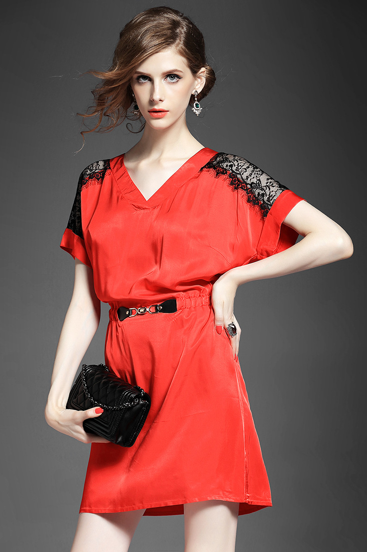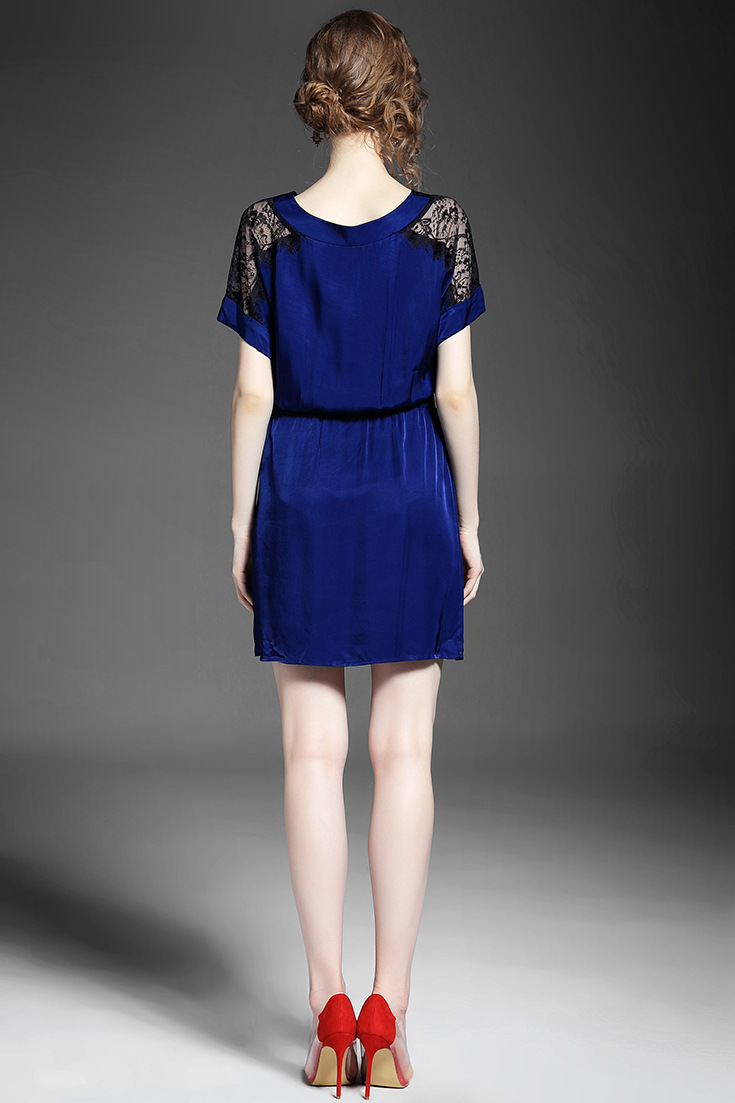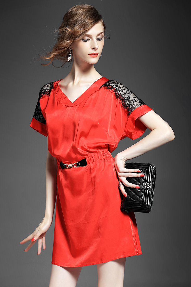 > 2015夏季新款女装 气质V领蕾丝拼接金属扣收腰修身连衣裙