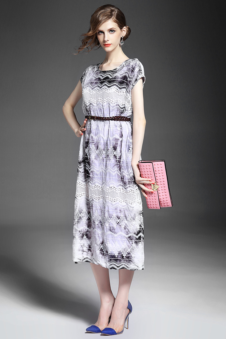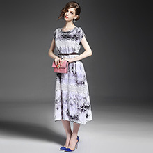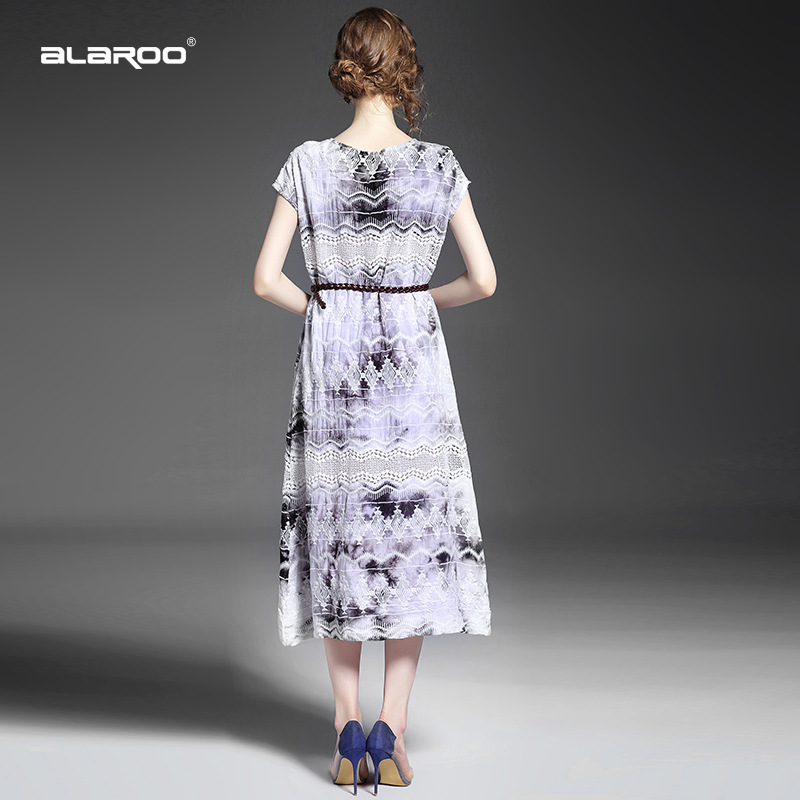 > 2015夏季新款 气质圆领包肩袖水墨印花镂空拼接收腰大摆连衣长裙