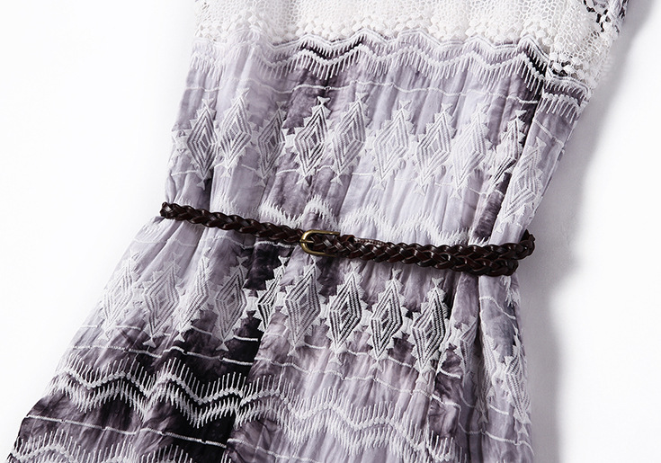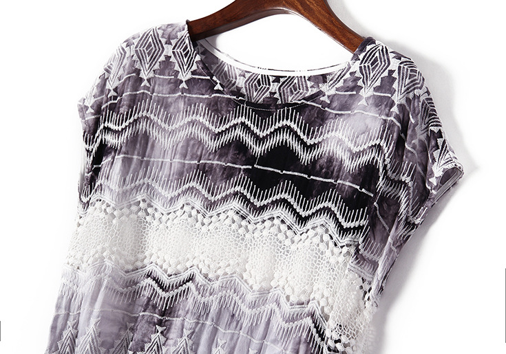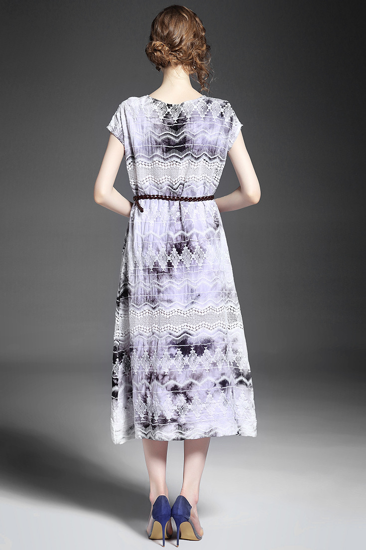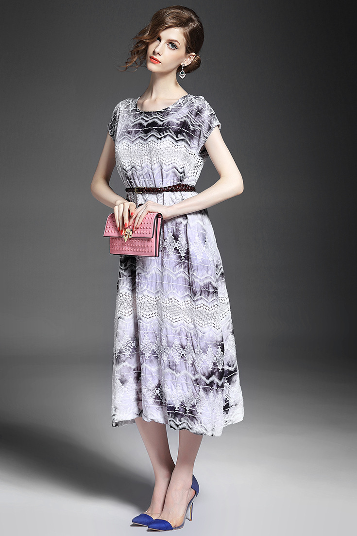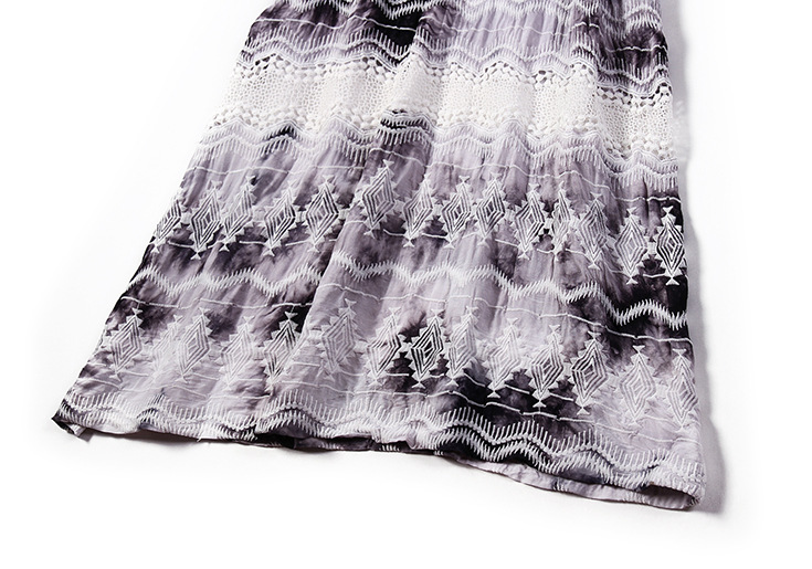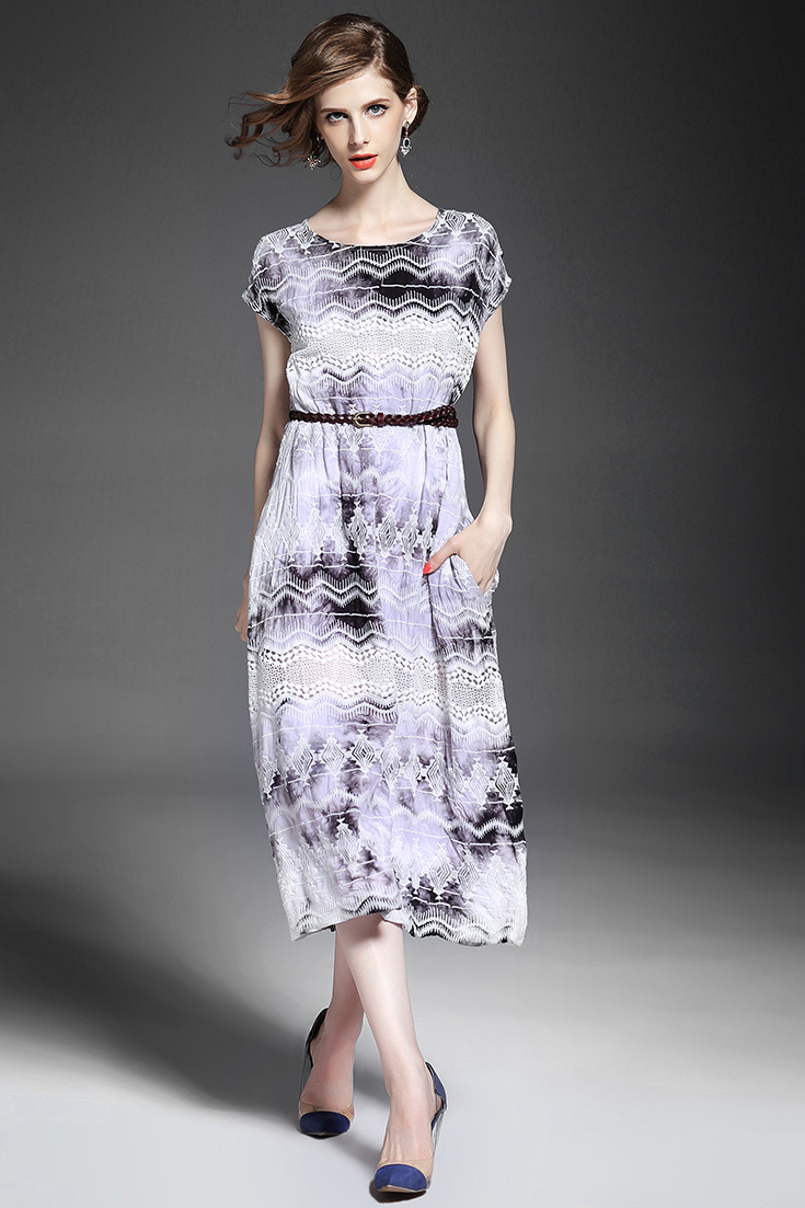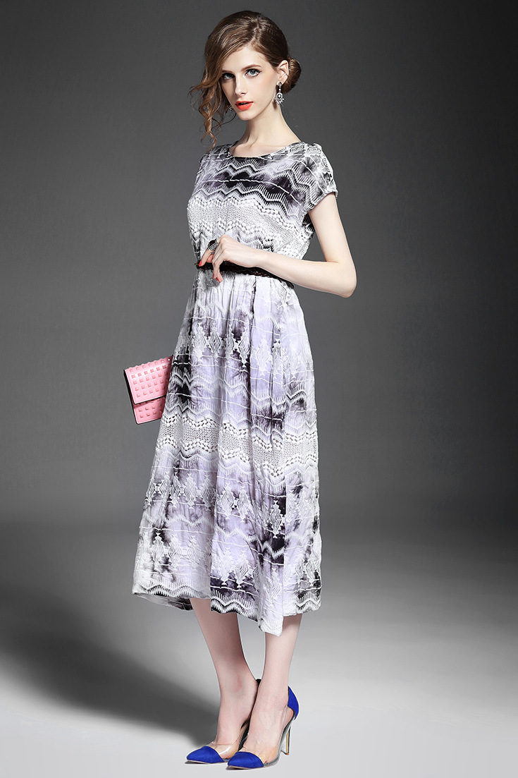 2015夏季新款 气质圆领包肩袖水墨印花镂空拼接收腰大摆连衣长裙
