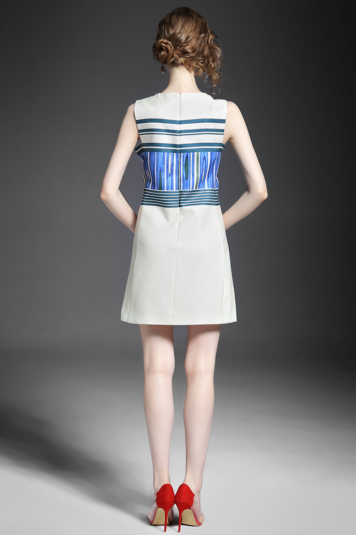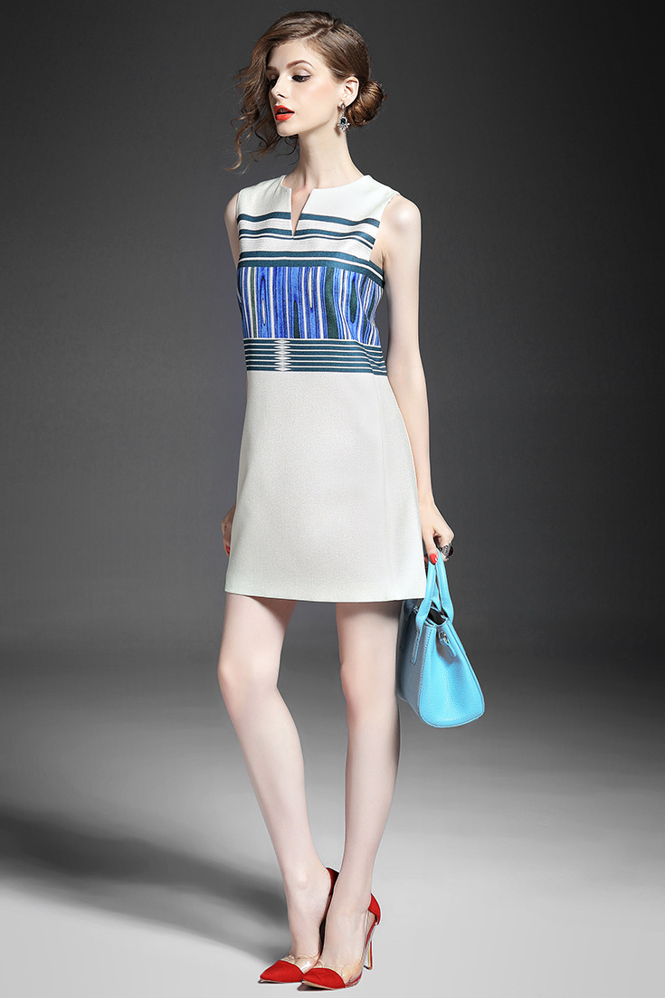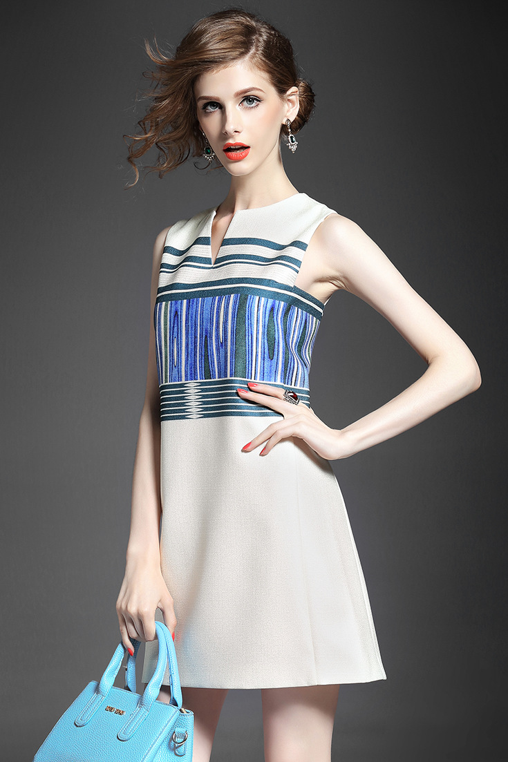 > 2015夏季新款 时尚V领条纹抽象印花收腰修身a字连衣裙