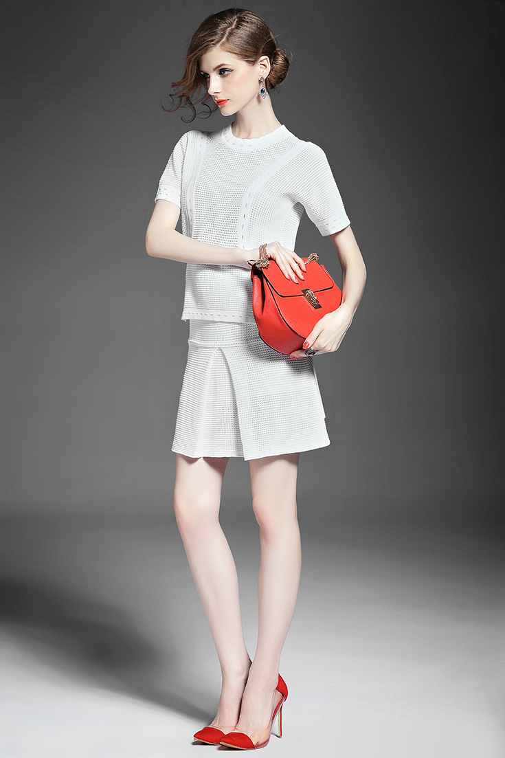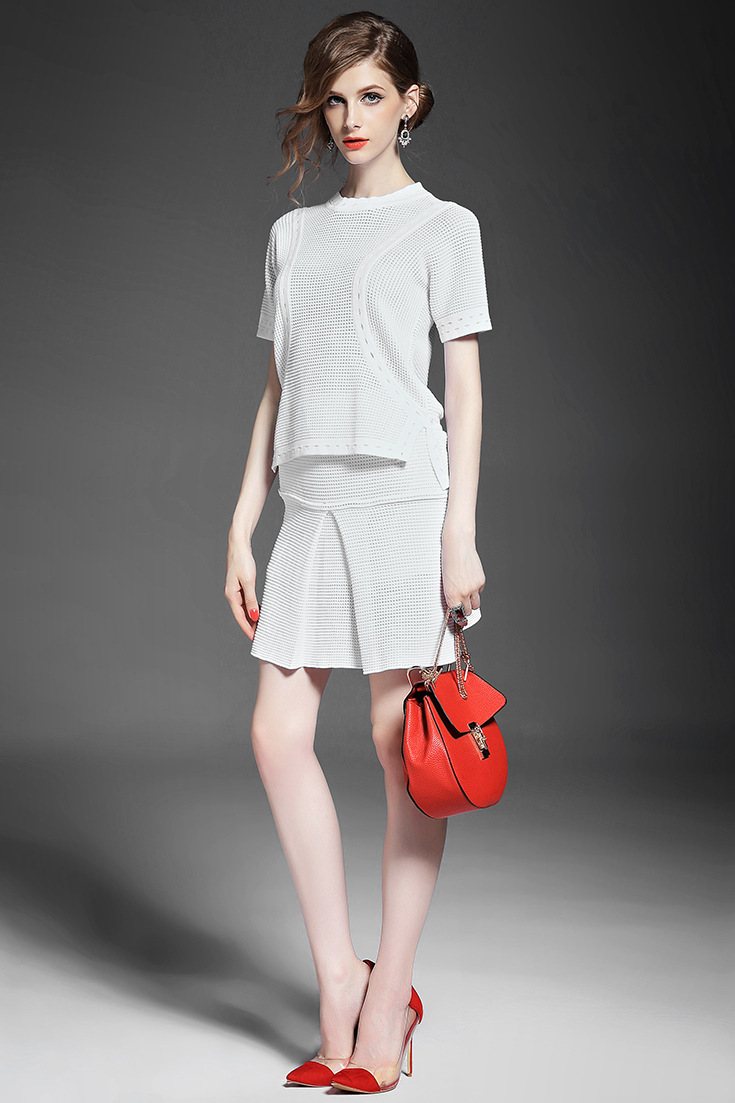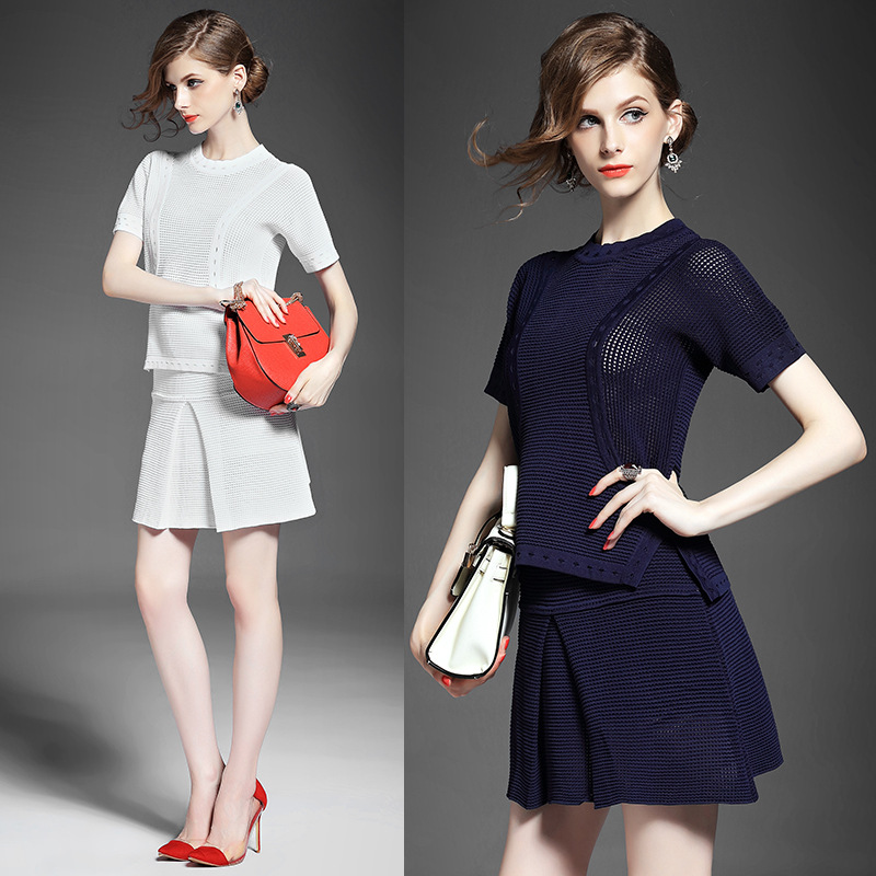 2015夏 欧洲高端纯色针织拼接不规则短上衣+修身包臀半裙套装女