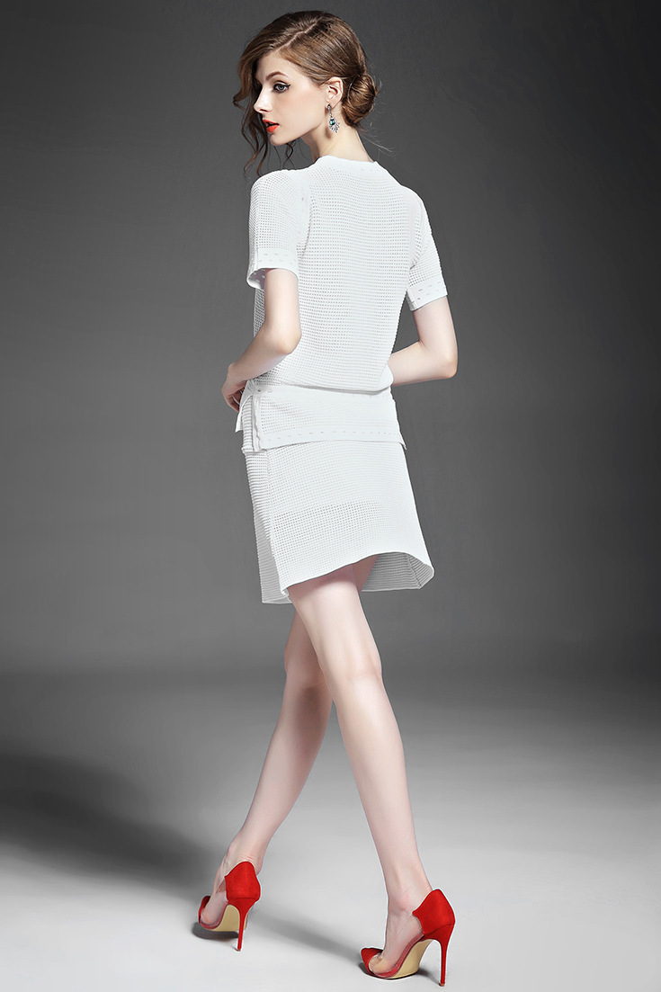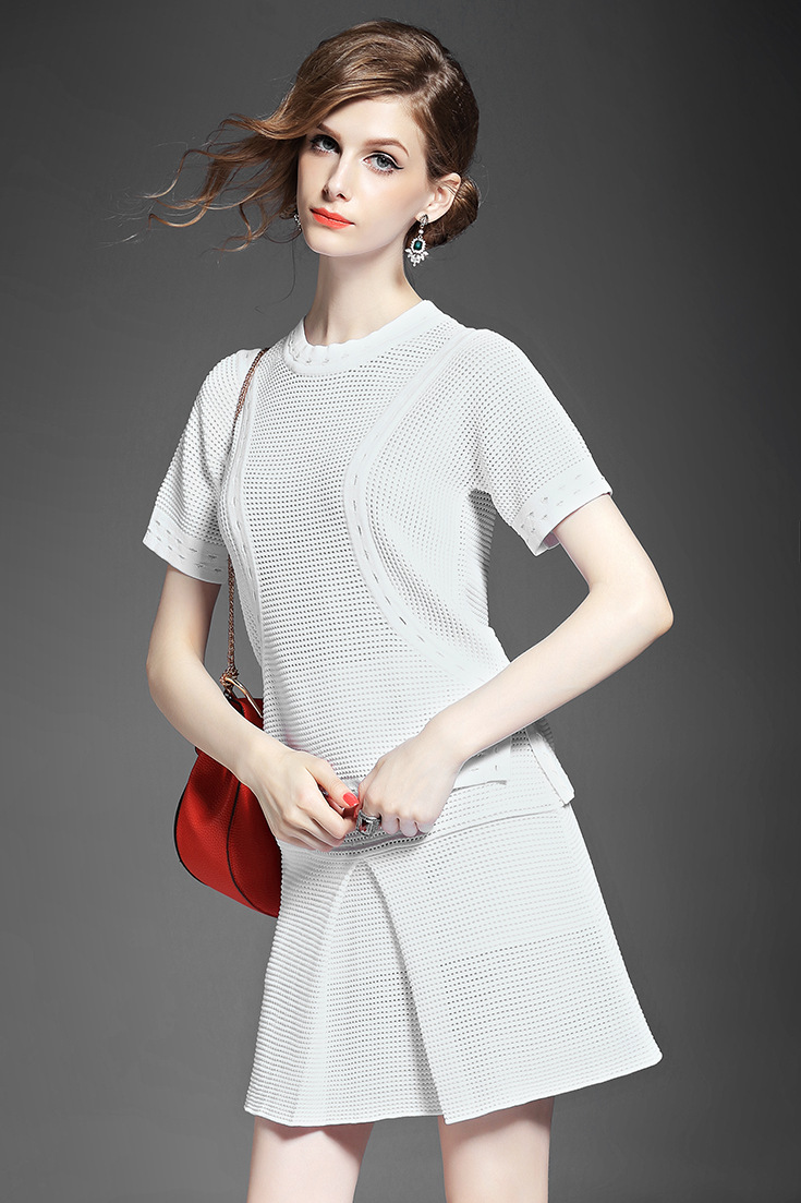 2015夏 圆领水溶绣花钉钻纯色上衣+弹力修身印花蓬蓬半裙套装