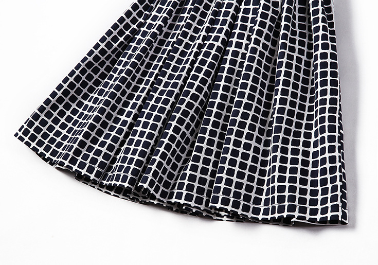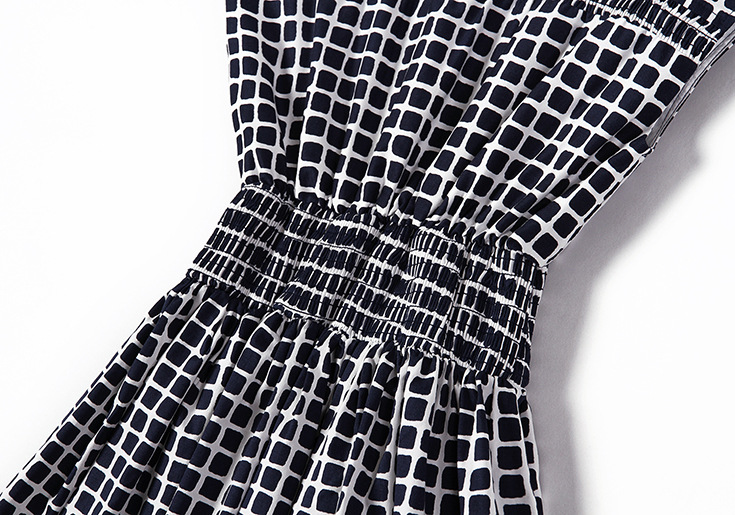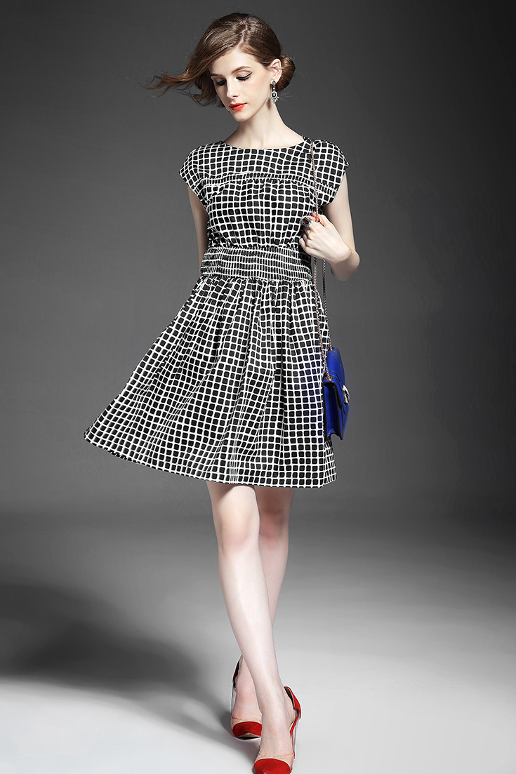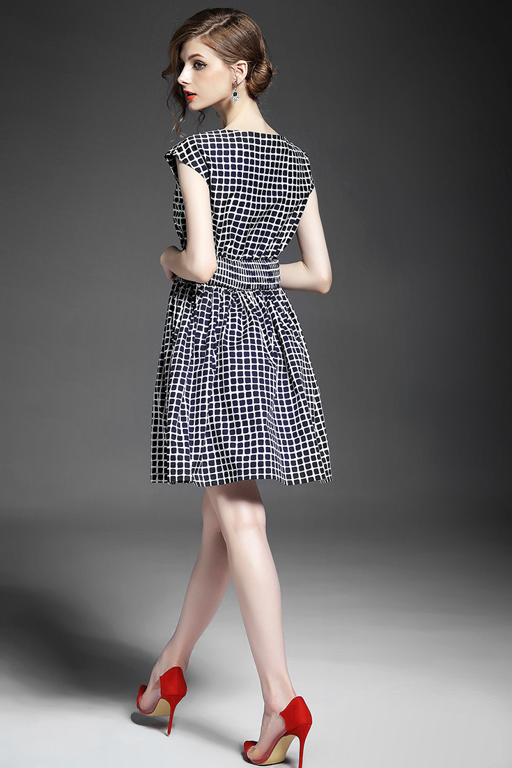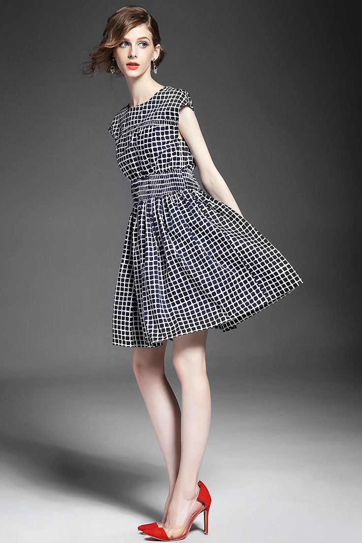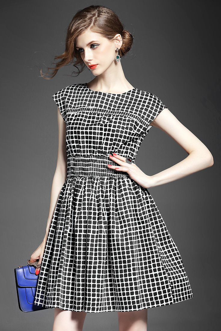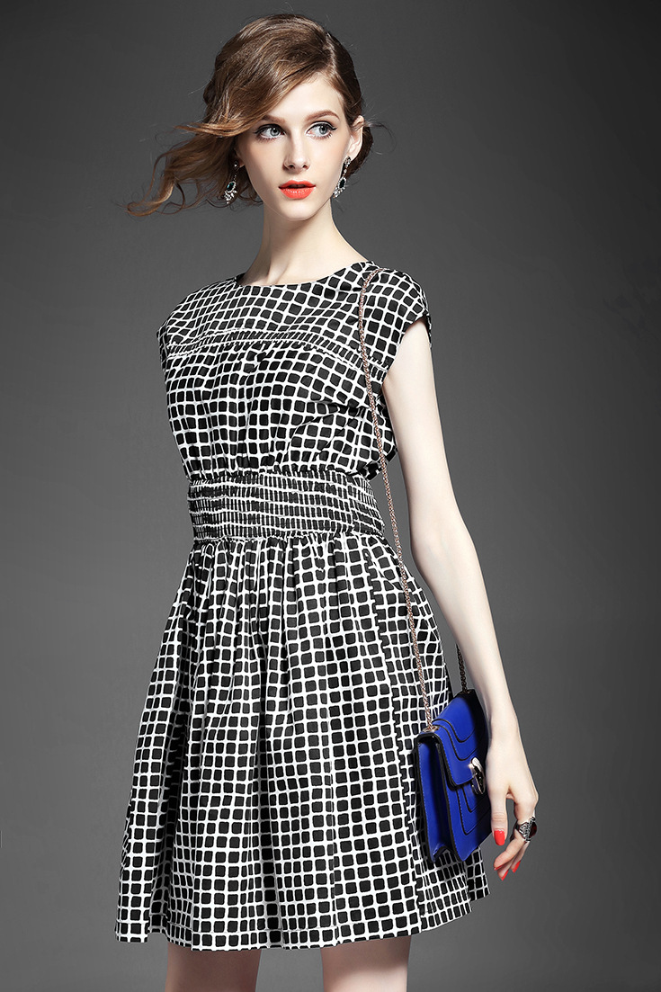 2015夏季新款女装 气质圆领包袖几何撞色印花弹力收腰a字连衣裙