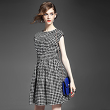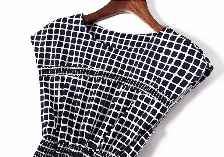 > 2015夏季新款女装 气质圆领包袖几何撞色印花弹力收腰a字连衣裙
