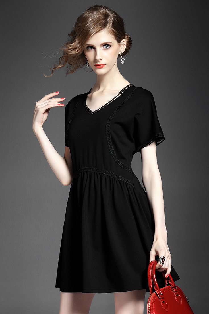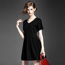 > 2015品质女装 时尚V领弹力镂空短袖压褶收腰修身连衣裙