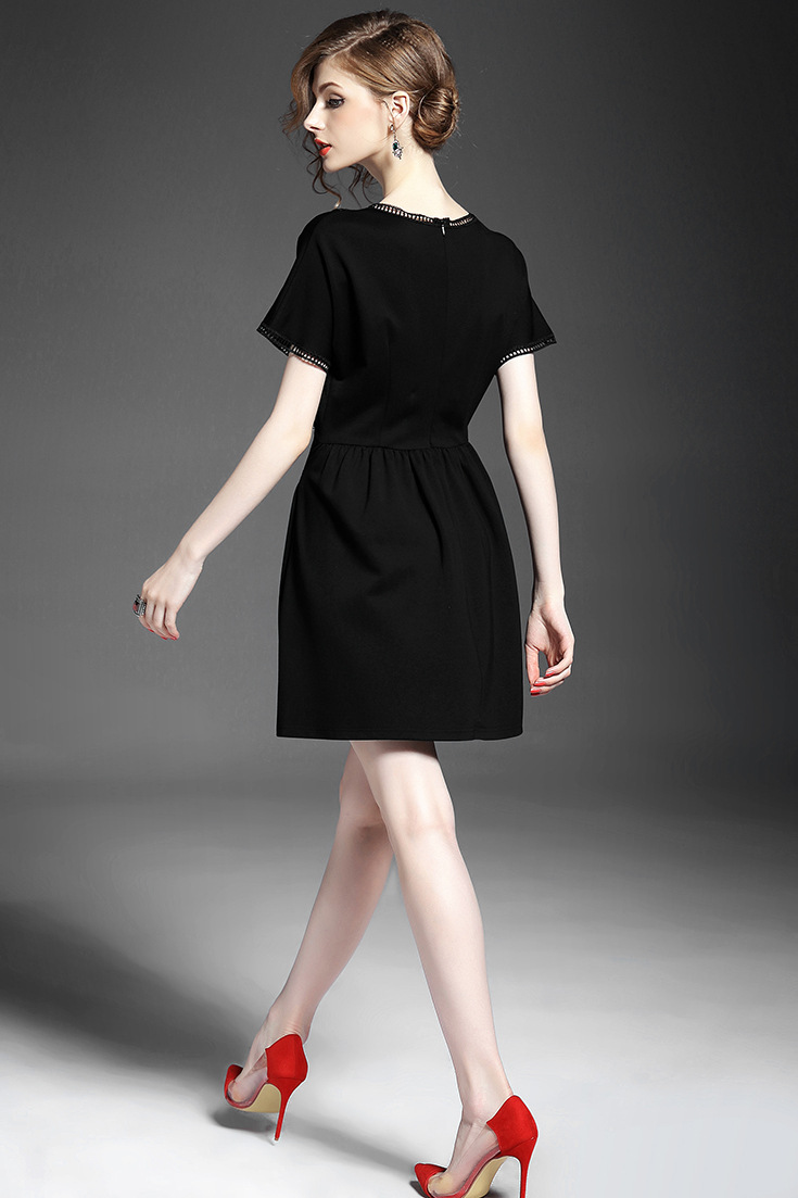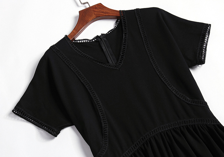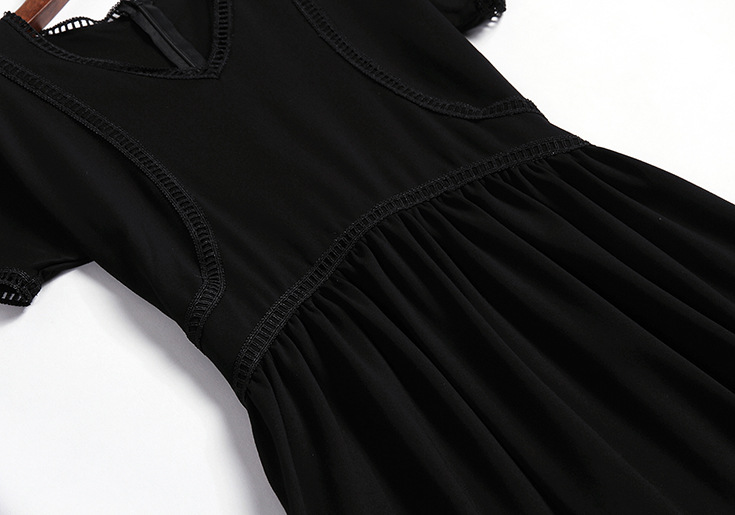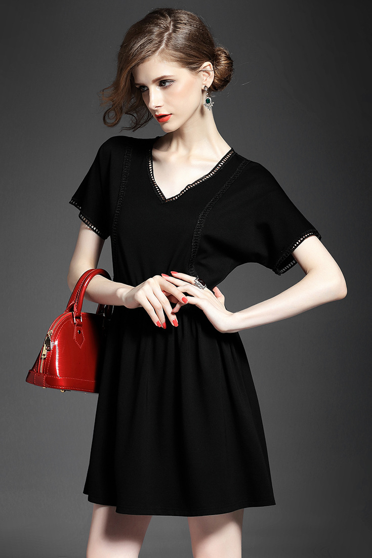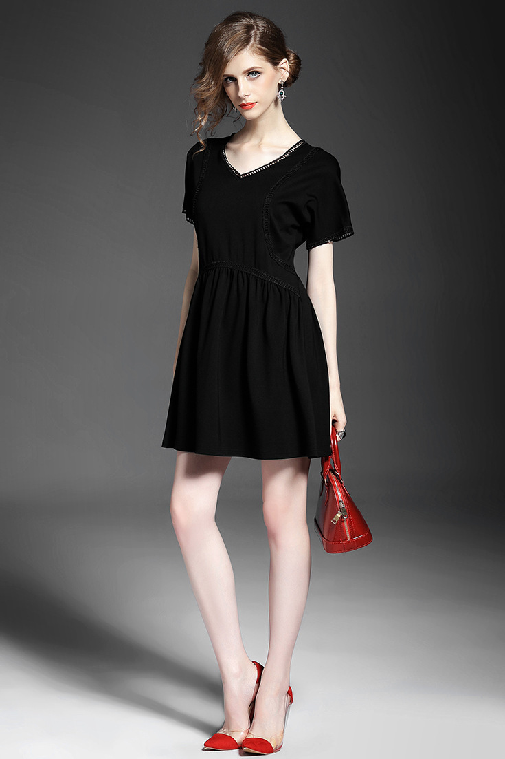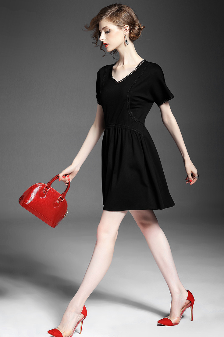 2015品质女装 时尚V领弹力镂空短袖压褶收腰修身连衣裙