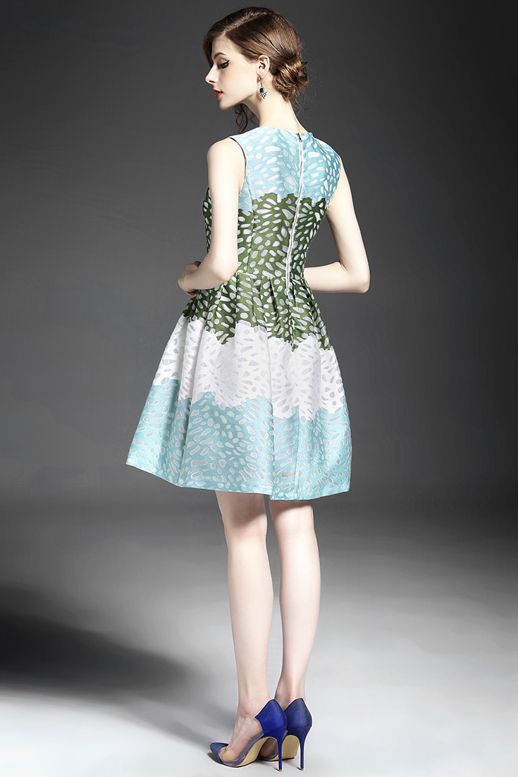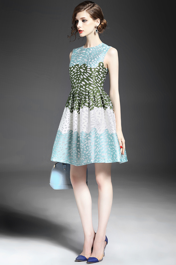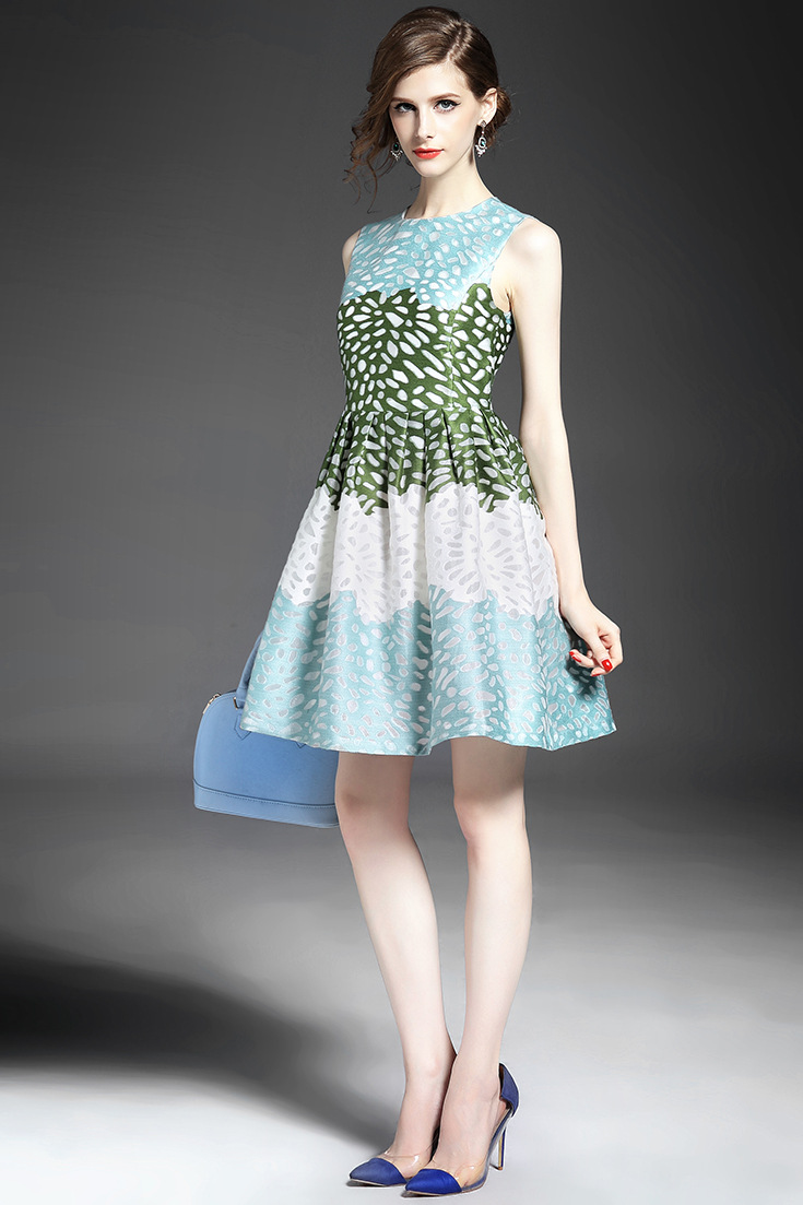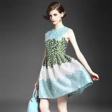 > 2015夏季品牌女装批发气质无袖圆领提花印花收腰修身a字裙