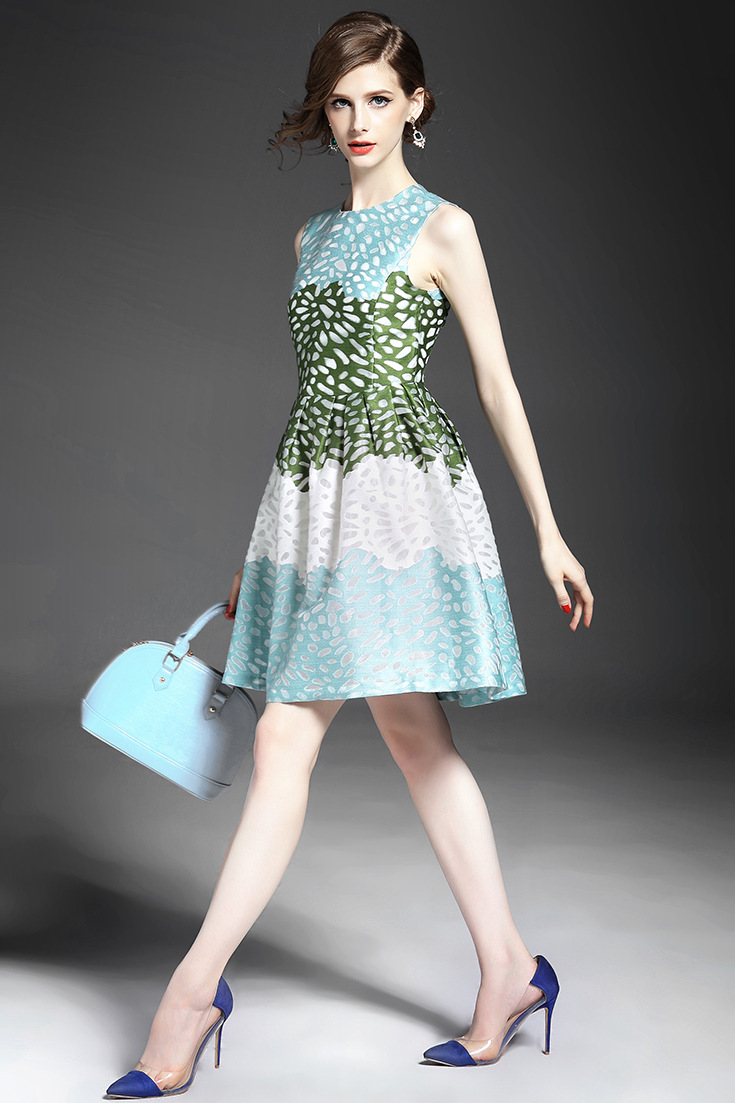 2015夏季品牌女装批发气质无袖圆领提花印花收腰修身a字裙
