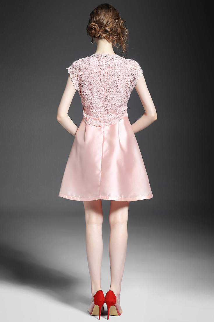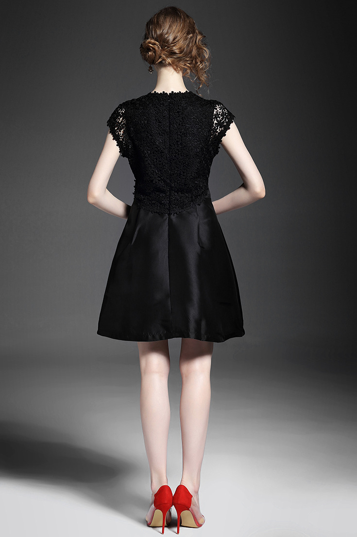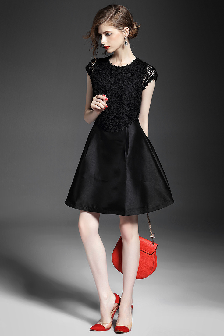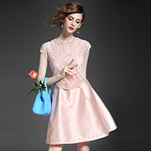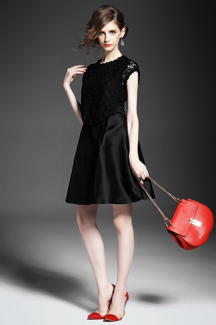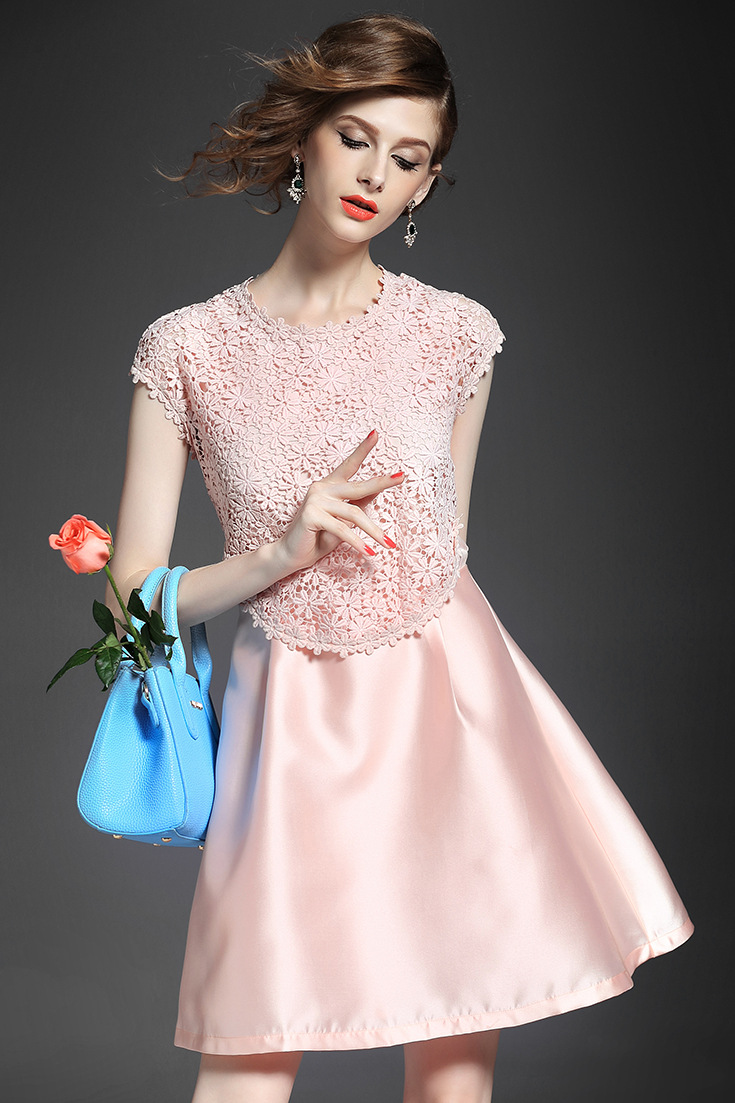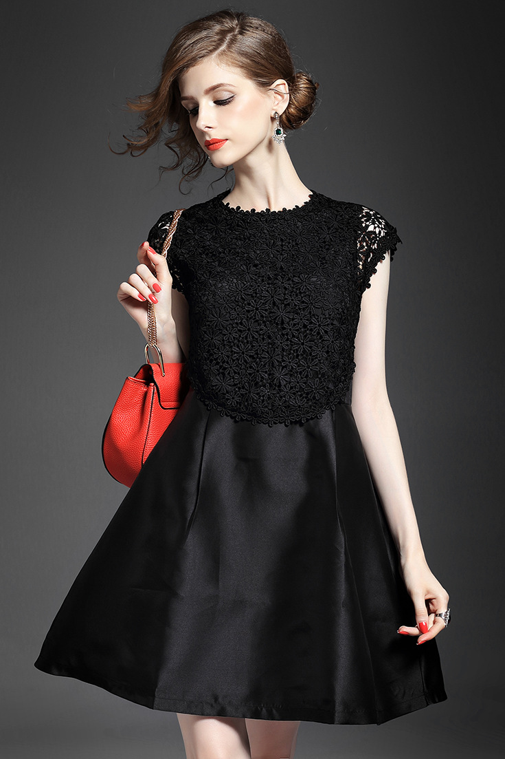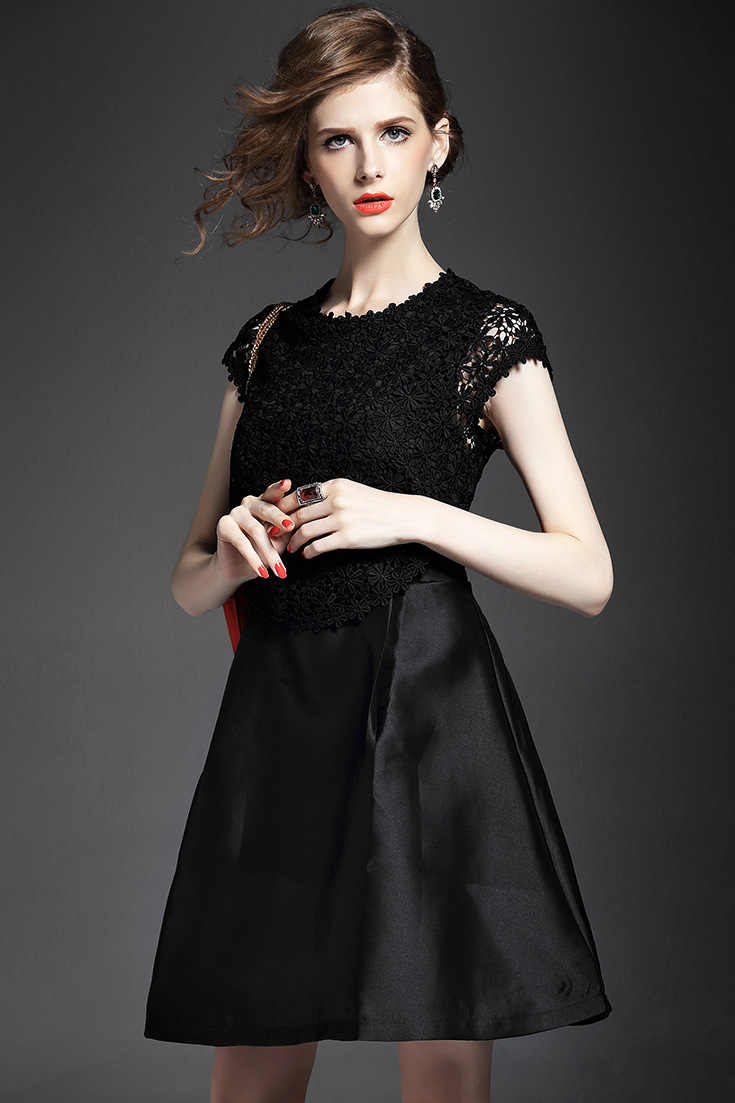 2015夏季新款 圆领包肩袖水溶绣花假两件拼接修身A字裙