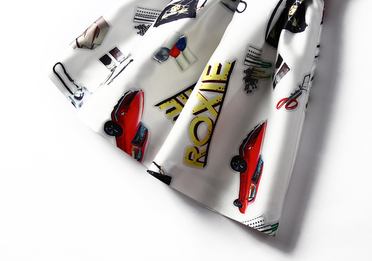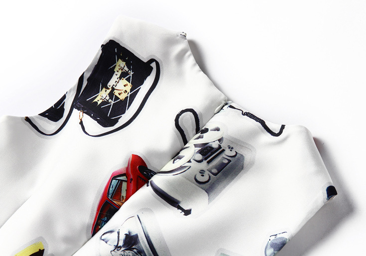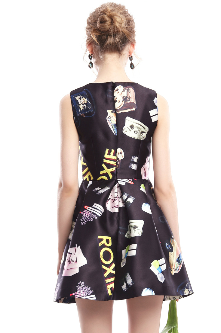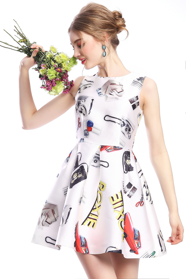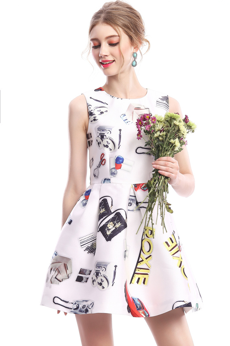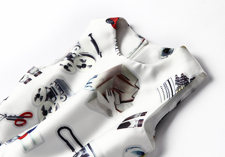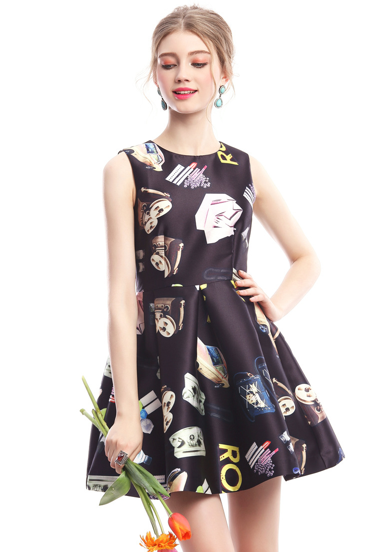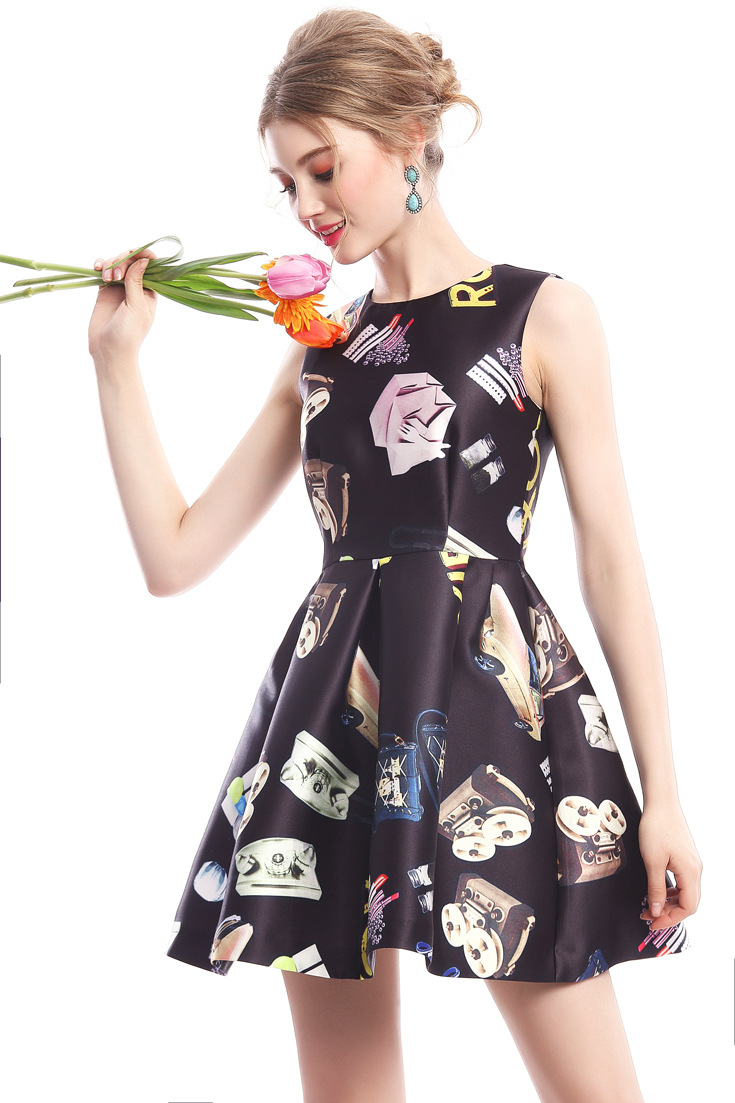 > 2015春夏品牌女装新款 圆领无袖斜纹印花修身A字裙连衣裙